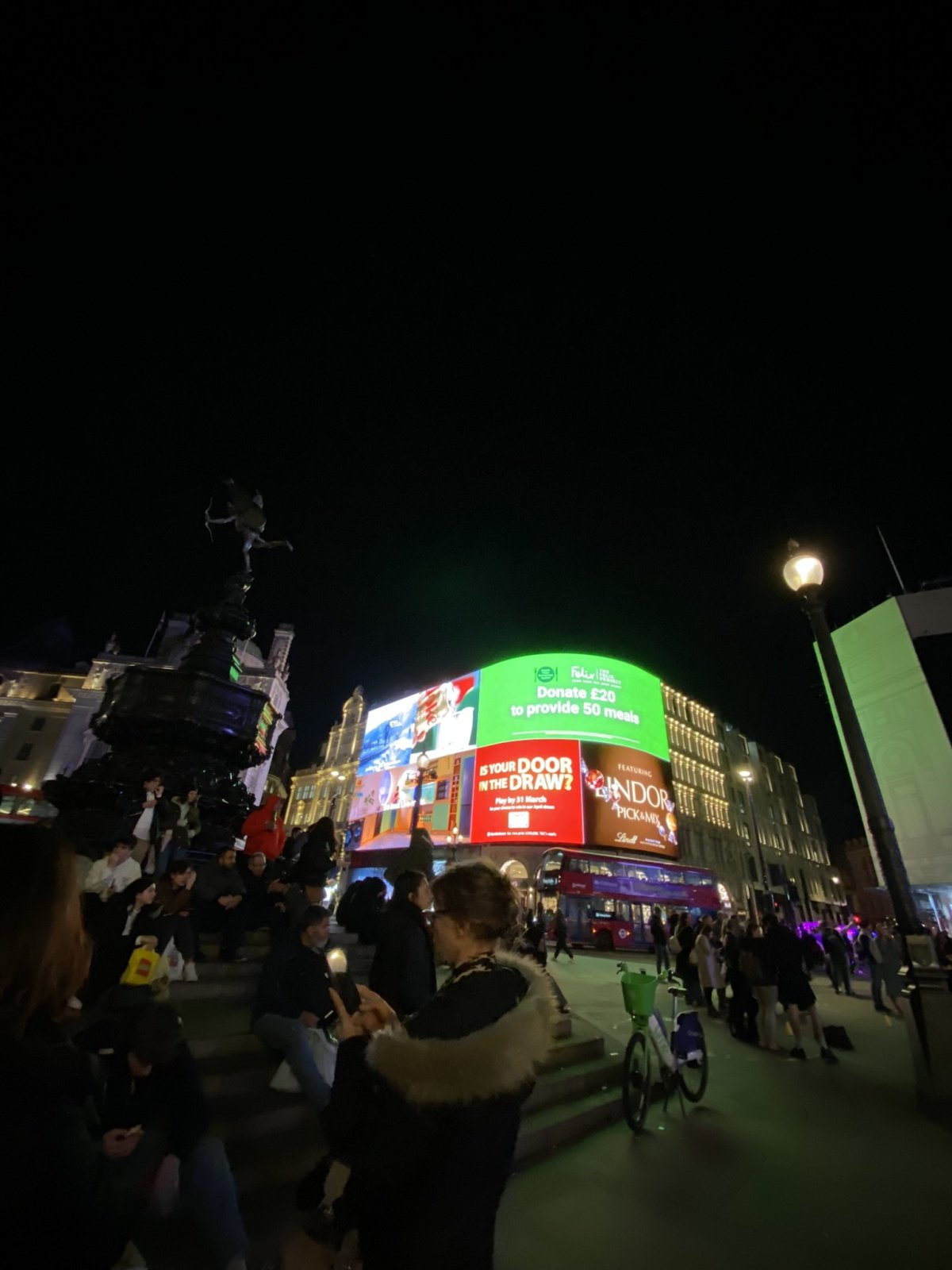 Mezitím co jsme vysedávali na večeři, tak se slunce schovalo, Londýn zahalila tma a zároveň rozzářily lampy, svítící bilboardy a jiné světelné předměty. Kam jinam se vydat za tmy než na Piccadilly Circus. Vystoupili jsme na Leicester Square, kde je slavná socha Mr. Beana, ale parčík i s dalšími sochami je otevřen pouze přes den. Pár ulic od tohoto náměstí je další a asi jedno z nejznámějších náměstích - Trafalgar Square, na kterém je Národní galerie. Celé náměstí bylo ozdobeno krásným hlasem kluka, který tam zpíval a hrál na kytaru. Museli jsme si chvíli sednout, zaposlouchat se a tento moment si užít.