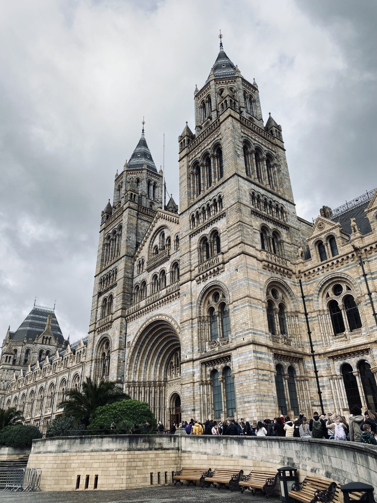 Líbí se mi myšlenka, že všechna státní muzea jsou zpřístupněna zdarma, aby je mohl navštívit opravdu každý. Jen je u všech potřeba rezervace. Není tomu jinak i u Natural History Museum. V dětství jsme s bráchou dost často koukali na DVD, kde byly dokumnety o dinosaurech. Postavičky dinosaurů také byly součástí naší krabice s hračkami a například Jurský park je dodnes jeden z mých nejoblíbenějších filmů. Při první návštěvě Londýna, jsme toto muzeum nenavštívili. Dost mě to lákalo, tudíž byla potřeba to napravit. Muzeum je otevřené od 10 hodin a naše rezervace byla na 10:15. Při výstupu z metra jsme se ocitli v nádherné jurské zahradě, která je přímo u budovy muzea. Zahradu zdobí zlatá kostra dinosaura. Samotná budova muzea je naprosto fascinující. Detailní sochy zvířat zdobí stěny a římsu na střeše. Poměrně dlouhá fronta byla rychle odbavena a po kontrole batohu jsme byli vpuštěni dovnitř. Muzeum je opravdu krásné, jen byla možná chyba v tom, že jsme muzeum navštívili v pátek ráno. Prohlídku nám znepokojovali všude řvoucí a poletující školáci. Expozice s dinosaury je krásná a poměrně zajímavá. Stejně tak expozice savců a ptáků. Spousta vycpaných zvířat a umělých plastik. Jen jsem měl trochu pocit, že se muzeum, co se týče interaktivních prostředků, zastavilo na začátku tohoto tisíciletí. Některé již ani nefungovaly. S porovnáním je naše Národní muzeum úplně někde jinde, ale stále to nebere Natural History Museum své kouzlo. Další expozice, které nás zaujaly byly o zemětřesení a evoluci člověka. Bylo tam krásně zpracováno, jak se člověk vyvíjel do dnešní podoby, včetně replik obličejů vývojových stupňů člověka dle kosterních pozůstatků.