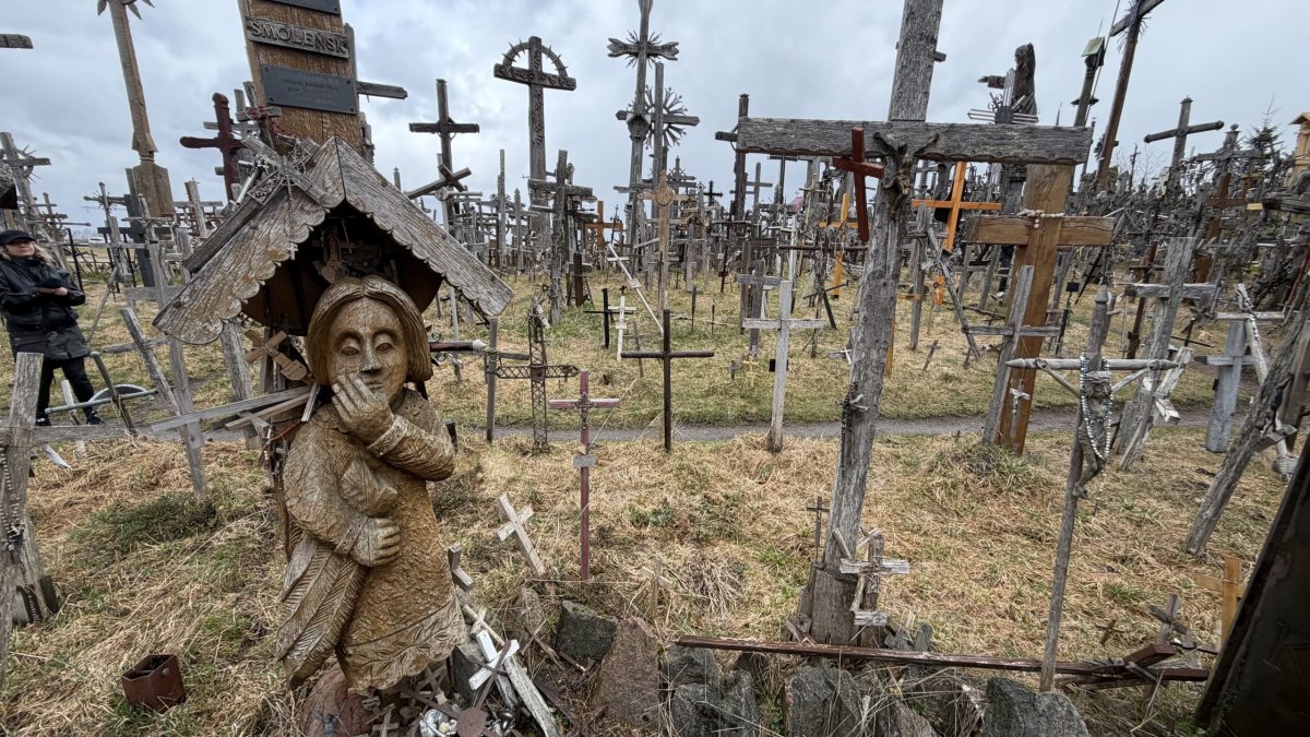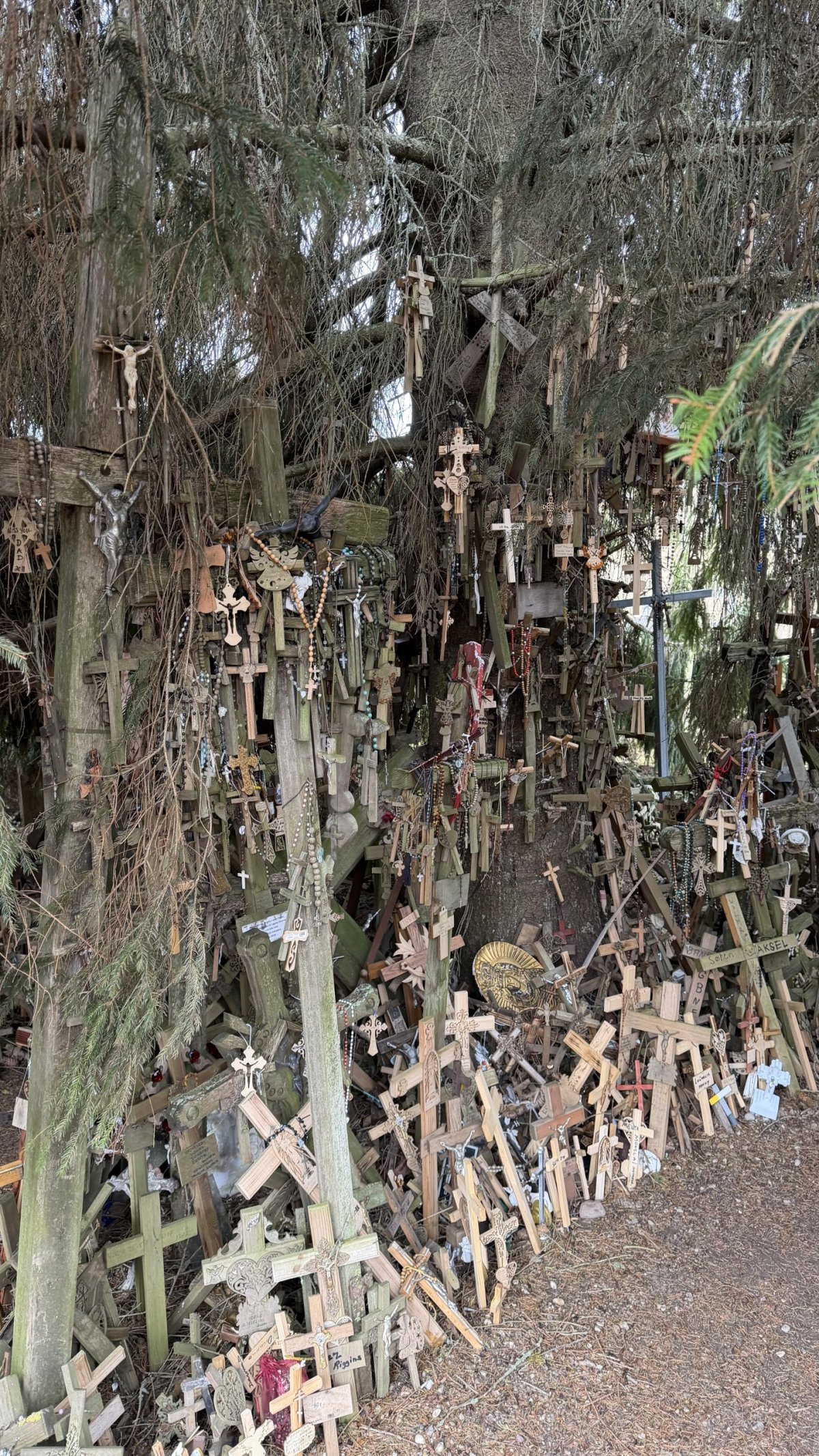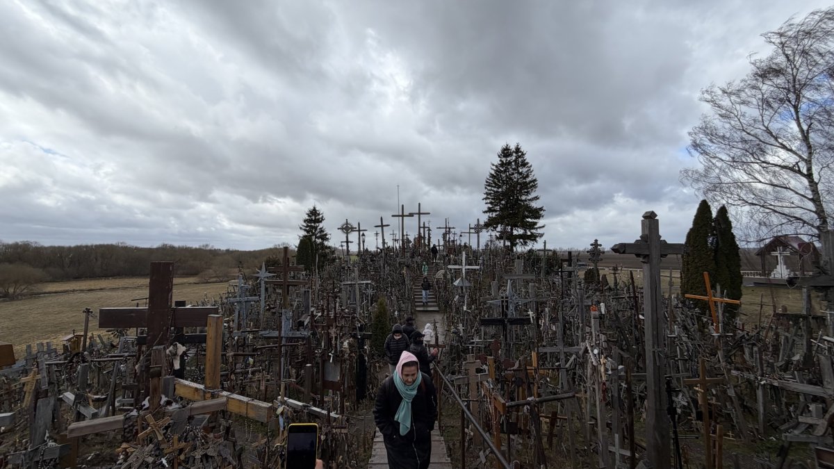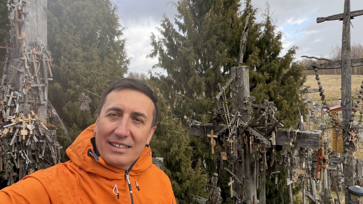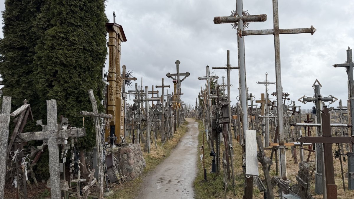 Po příjezdu průvodce jsme vyrazili směrem na jih, do Litvy. Hlavním cílem byla Hora křížů (Kryžių kalnas), jedno z nejznámějších poutních míst v Pobaltí. Na první pohled působí skoro surrealisticky – tisíce a tisíce křížů všech velikostí, od drobných dřevěných po velké kovové, hustě pokrývají malý pahorek. Odhady mluví o 200 až 300 tisících křížů, které sem lidé nosí jako symbol víry, naděje nebo památky na své blízké. Místo má silný historický význam – zejména během sovětské éry bylo opakovaně ničeno, ale lidé kříže stále znovu vraceli. V roce 1993 sem zavítal i papež Jan Pavel II., čímž jeho význam ještě vzrostl.