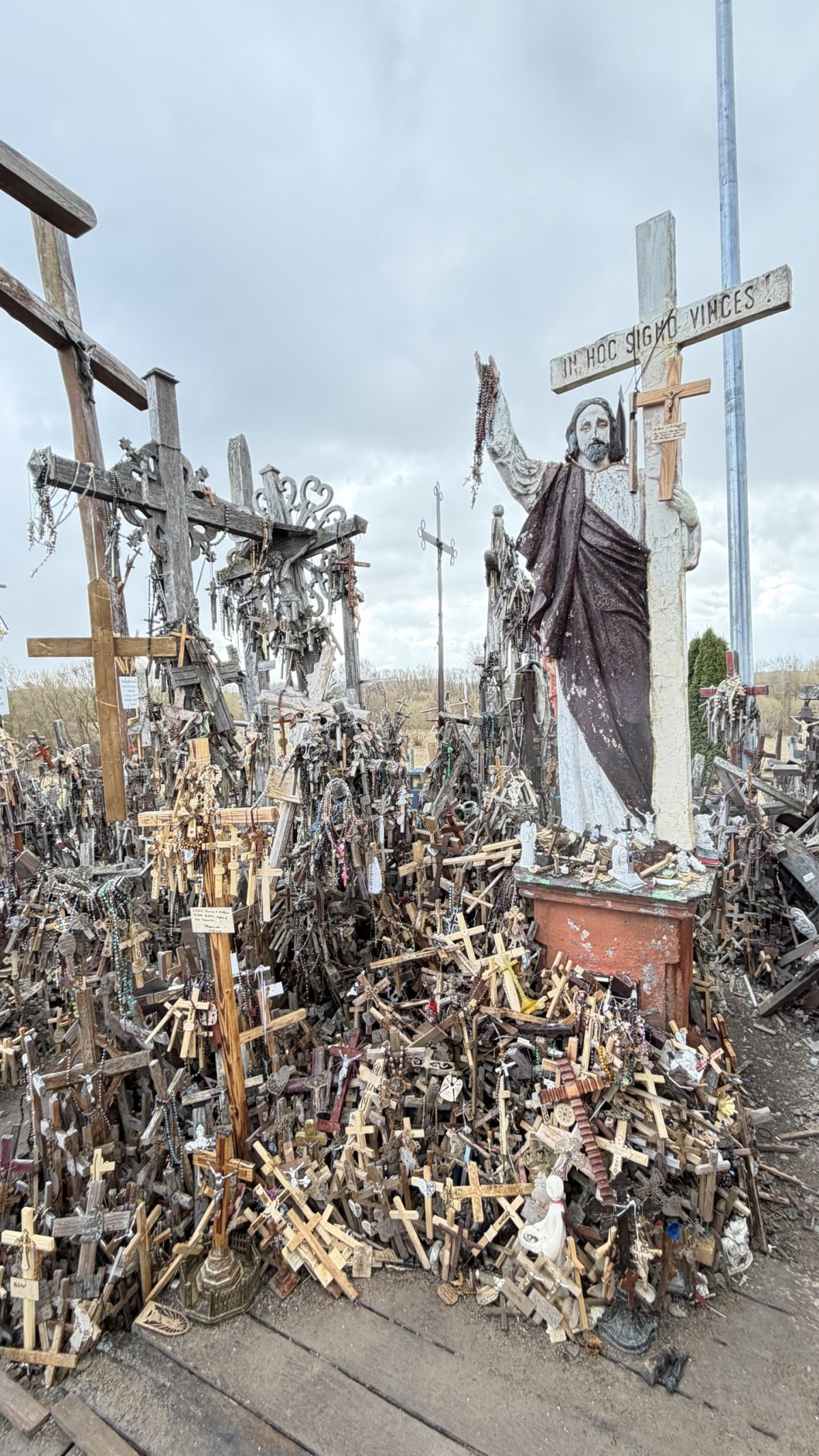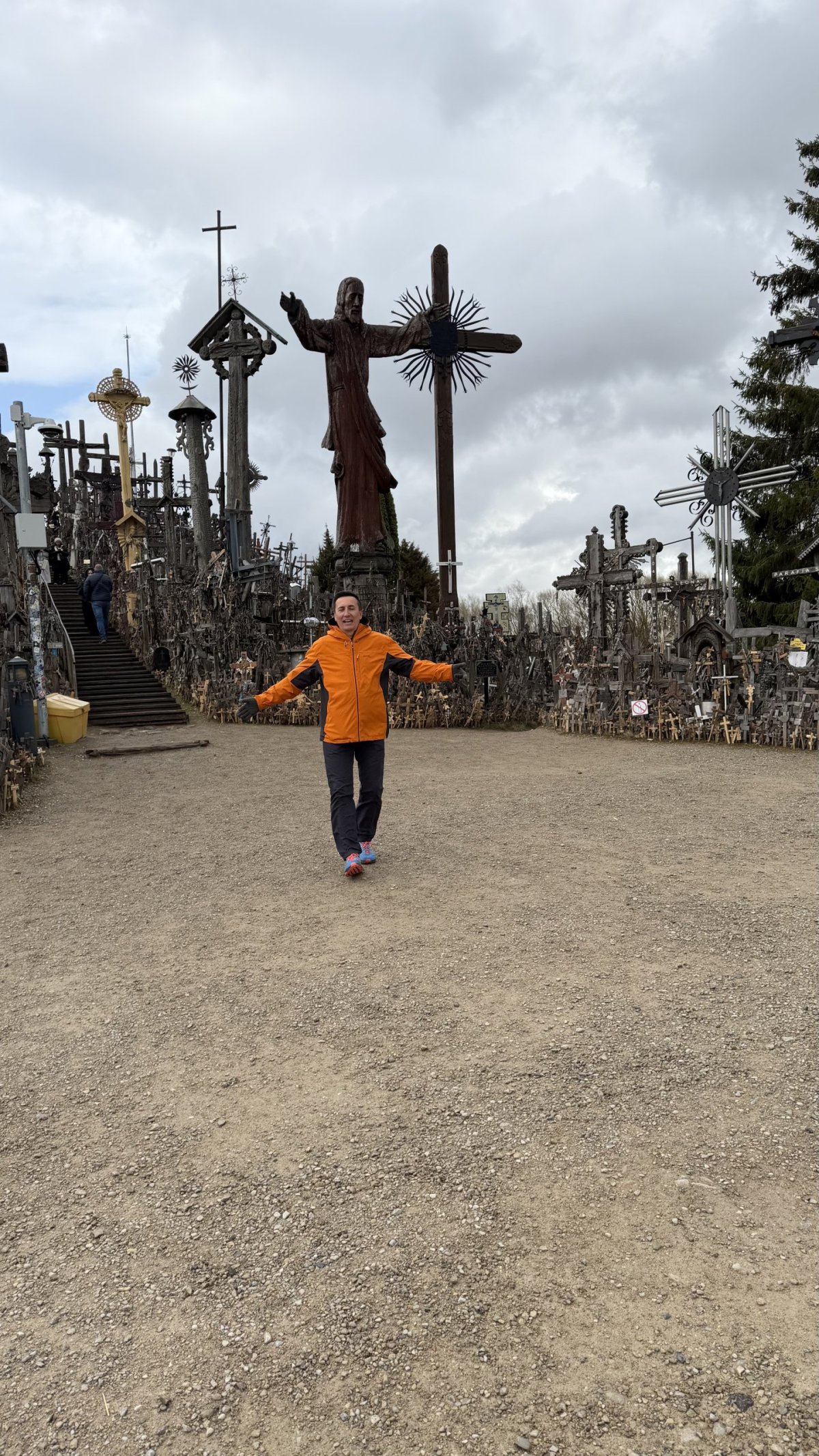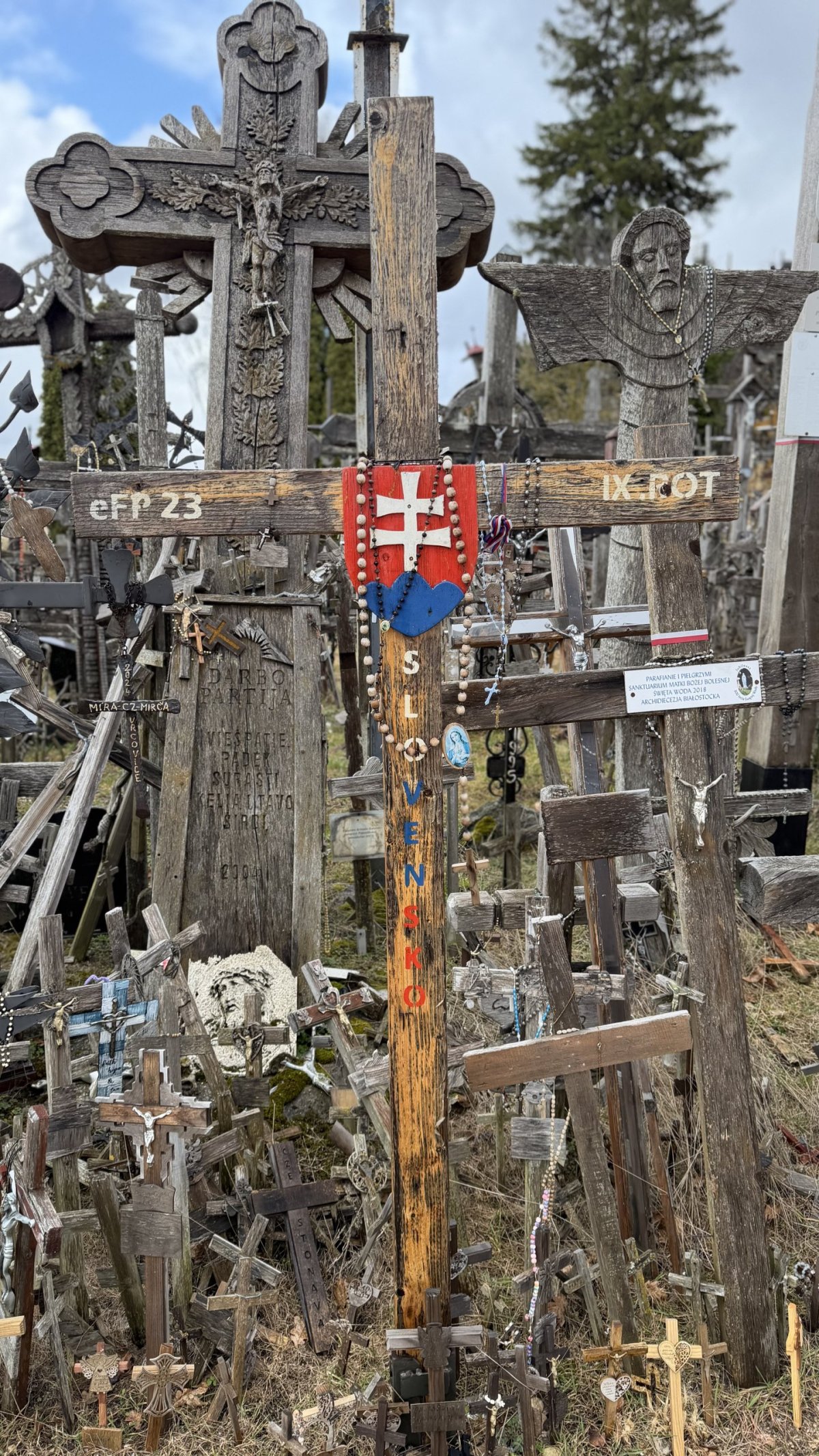 Po příjezdu průvodce jsme vyrazili směrem na jih, do Litvy. Hlavním cílem byla Hora křížů (Kryžių kalnas), jedno z nejznámějších poutních míst v Pobaltí. Na první pohled působí skoro surrealisticky – tisíce a tisíce křížů všech velikostí, od drobných dřevěných po velké kovové, hustě pokrývají malý pahorek. Odhady mluví o 200 až 300 tisících křížů, které sem lidé nosí jako symbol víry, naděje nebo památky na své blízké. Místo má silný historický význam – zejména během sovětské éry bylo opakovaně ničeno, ale lidé kříže stále znovu vraceli. V roce 1993 sem zavítal i papež Jan Pavel II., čímž jeho význam ještě vzrostl.