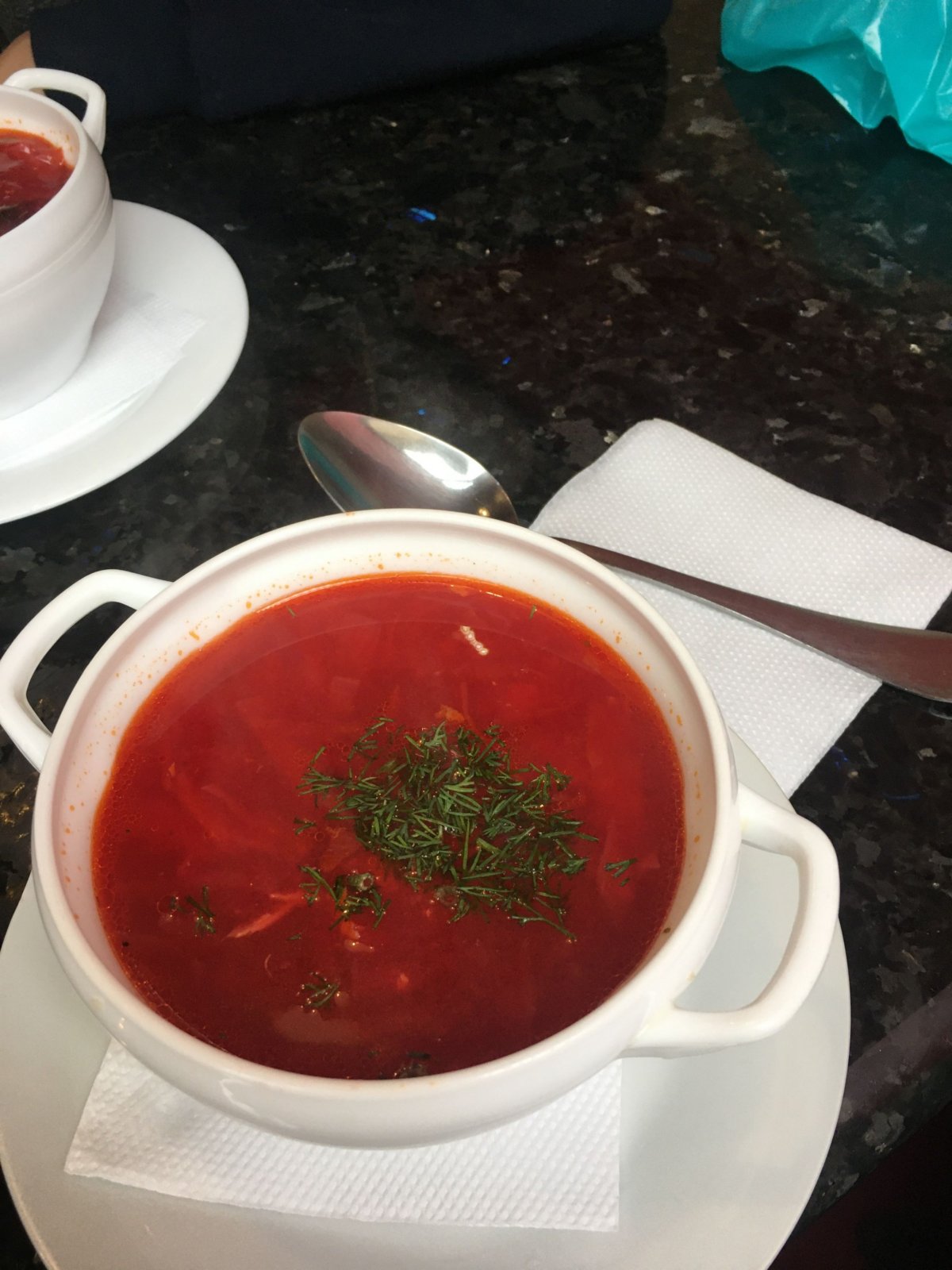 Teď bylo důležité se najíst. Měli jsme vyhlídnutou restauraci “Puzata chata”. Zde evidentně vaří skvěle, protože fronta se táhla snad přes půl města. K naší smůle asi 2 minuty před námi naklusala do řady banda snad 30 dětí. Strávit půl dne čekáním na jídlo jsme neměli v plánu, a tak jsme se vraceli směrem na náměstí a hledali jinou variantu. Nakonec jsme zakotvili v pizzerii Pepito, kde jsme si objednali boršč. Na světě je jen málo věcí, které bych neměla ráda. Jednou z nich, je kopr. Doposud jsem se mu úspěšně vyhýbala (a to i v Bělorusku, kde ho strkají snad do všeho). Zelená hromada kopru se naštěstí dala z boršče lehce odstranit, a tak jsem nemusela dlouho poslouchat bratrovy řeči o tom jak si umím dobře vybrat a ironické poznámky o tom jestli mi chutná.