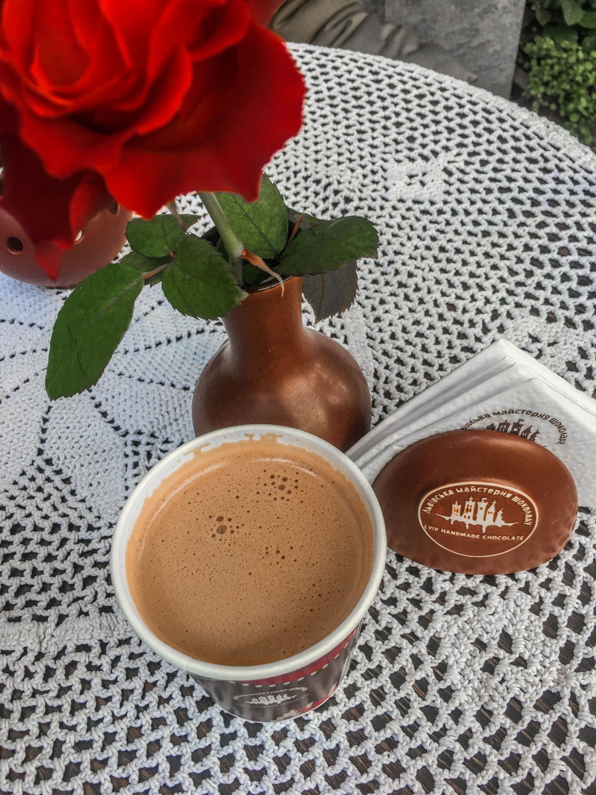 Po téhle podle bratra: únavné a hrozné půlhodině v obchoďáku jsme šli za čokoládou do ''Lviv handmade chocolate''. Horká čokoláda po Lvovsku byla jednoduše vynikající. Vychutnávali jsme si ji a pozorovali okolí. Ani se nám nechtělo zvedat.