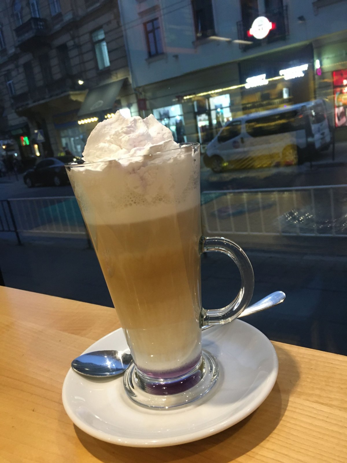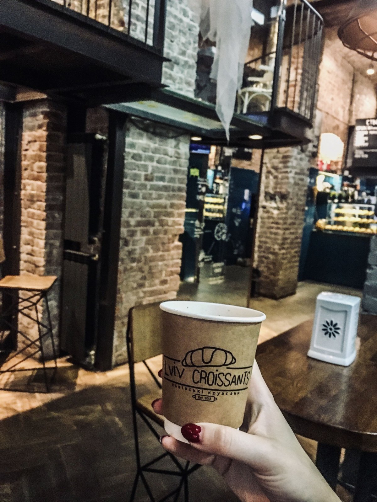 Čas běžel, a vzhledem k tomu, že jsme měli jen skromný oběd, jsme se už kolem pěti rozhodli pro brzkou večeři. Volba padla opět na Lvovské croissanty. Tentokrát jiná pobočka, ať nevysedáváme trapně zase v té stejné. Ve městě jich je plno a na jinou narazíte pomalu co pár metrů. Času bylo stále dost a tak jsme změnili rajón. Lvov je město kávy a tak by byla škoda nezkusit nějakou speciální (přece jen jsem za celý den měla jen dvě obyčejné espresa). V kavárně Aroma káva mě zaujala káva s levandulí. Nejdřív jsem měla pocit, že levandulový sirup chutná spíš jako prostředek na mytí nádobí. I když to nerada přiznávám, tak musím říct, že mi po upití asi čtvrtky hrnku opravdu začala chutnat. Pokud by jste však chtěli zůstat u tradičního Latte nebo kapučína, tak ty zde samozřejmě k mání také jsou.