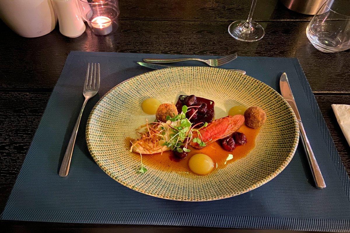 👉Růžová kachní prsa, celerový krém, višeň, krokety z červeného zelí