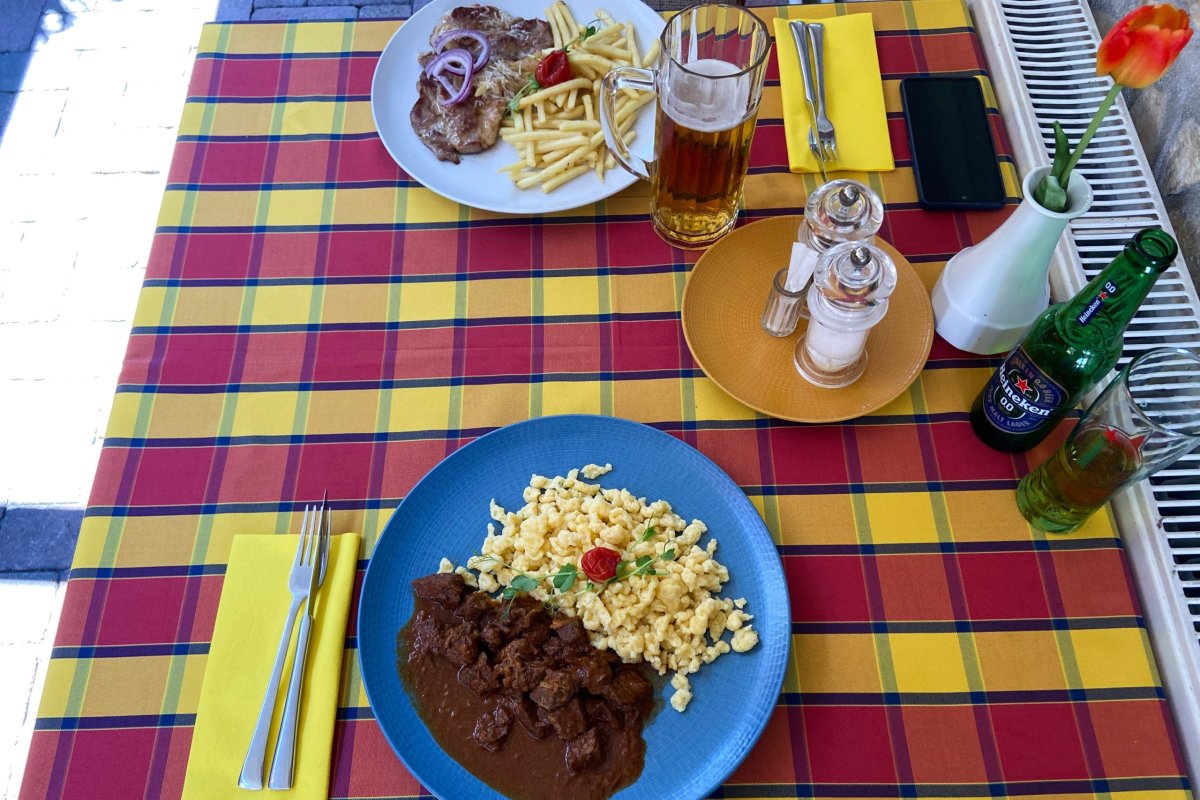 Večer už jdeme na véču na stejné místo jako v poledne. Gulyás udvar Étterem je přímo na náměstí a nabízí místní klasiky, dobrá domluva i servis. Kachna i guláš oboje v pořádku. Celkově ale ceny v celém okolí tedy nejsou tak příznivé, jak si pamatujeme z poslední cesty do Maďarska, ta jejich hyperinflace je asi poznat.