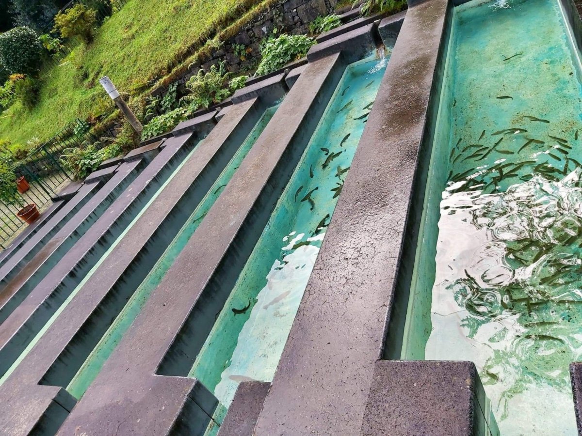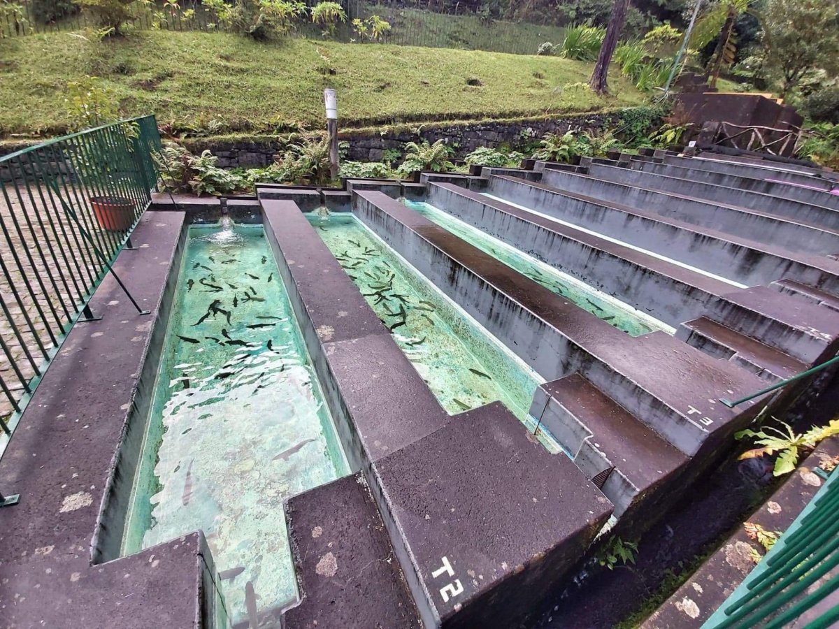 Cestou jsme udělali zastávku v pstruhárně.. Vstup gratis a krásné sádky plné ryb. Krásné počasí. Zatím..