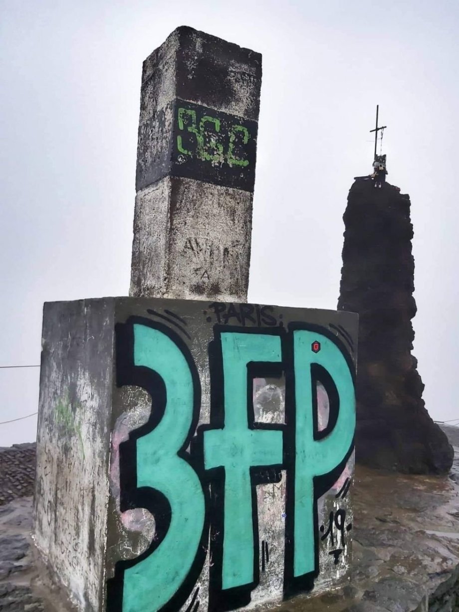 Když jsme se konečně vydrápali na vrchol hory na parkoviště, stálo tam jen jediné auto. Ani se nedivím, v tomhle počasí by do hor lezl jenom blázen…🙈✌️ Vylezli jsme z auta, vichr mi málem vytrhl dveře i s rukou z ramenního kloubu… Nezažila jsem nikdy orkán, ale představuju si ho přesně tak, jako na vrcholku téhle hory. V podstatě jsem se držela všeho možného, co po cestě bylo a bylo očividně zakotvené i v zemi. Takto jsme se vyšplhali na místní vyhlídku, ze které byla vidět pouze bílo bílá mlha.