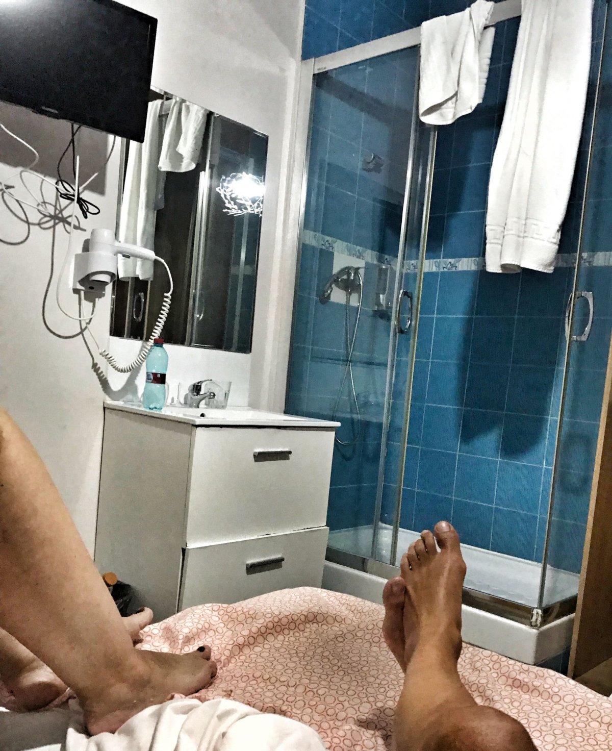 Sedíme u balkonku (na balkon se nevlezeme, tam sedí klima), vstřebáváme dojmy a kocháme se vyhlídkou na město… Bydlíme v centru města, samozřejmě za Kačku, prosklená sprcha na pokoji🔝😂a pecka pro nás holky na závěr: 300 metrů od nás Primark 🙈🙈