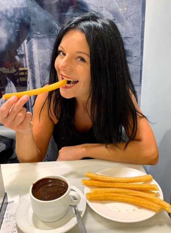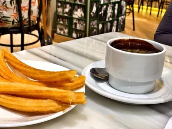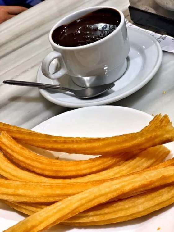 Také jsou vyhlášenou místní dobrotu místní churros. Jedná se o sladké pečivo podobné koblihám. Připravuje se z mouky, vody, olivového nebo slunečnicového oleje, cukru a soli, které se zpracují na odpalované těsto. Těstem se naplní válec s pístem a tryskou zvaný churrero a z něj se vytlačují tyčinky nebo spirály s hvězdicovitým průřezem, které se rychle osmaží na rozpáleném oleji do zlatova. Churros se jí horké a křupavé, obalené v cukru se skořicí, případně polité čokoládou či karamelem nebo plněné krémem. Churros se v Madridu prodávají na každém rohu, a to buď čerstvě připravené u pouličních stánků nebo ve specializovaných restauracích - churrerías. Zejména ve vyhlášené čokoládovně se šálkem horké čokolády je to dokonalá delikatesa! Cena není rozhodně přemrštěná, vezmu-li v potaz, že jsme si tuto dobrotu daly v místní nejvyhlášenější čokoládovně. Hrníček husté horké čokolády, ve které lžička stála, a porce 6 kousků churros vyšly na 4,2 euro. Jelikož jsme se z toho nasnídaly dvě, beru to jako prima snídani.
