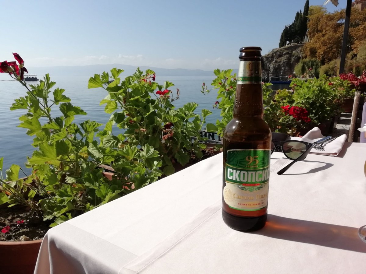 Po procházce centra jsme dostali hlad, tak jsme zkusili hledat jídlo v blízkosti jezera Ohrid. Oběd jsme dali v restauraci Kaneo (https://1url.cz/2MYeB). Stůl přímo u jezera. Byl čas na první místní pivo!