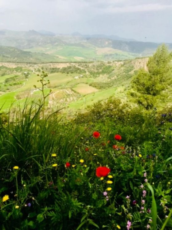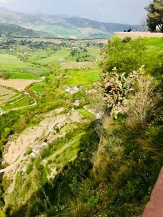 Cestou srkze malinký, ale na jaře neuvěřitelně krásný, park jsme došly na kraj útesu. Zde se před námi otevřel výhled na celé údolí a část starého města stojícího na masivní skále. Vše lemováno pásem vlčích máků.... Nejpůsobivější výhledy na krajinu jsou rozhodně v městském parku na balkóně zvaném El Balcon del Coño. Prostě vyhlídka za všechny prachy....