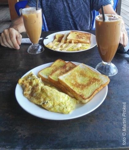 Nejlepší palačinky pod sluncem – zapečené sbanánem, melounem a ananasem je nejlepší start takového tropické dne, a ktomu ledová káva. Naposled využíváme moře kšnorchlování a opalování před odjezdem.