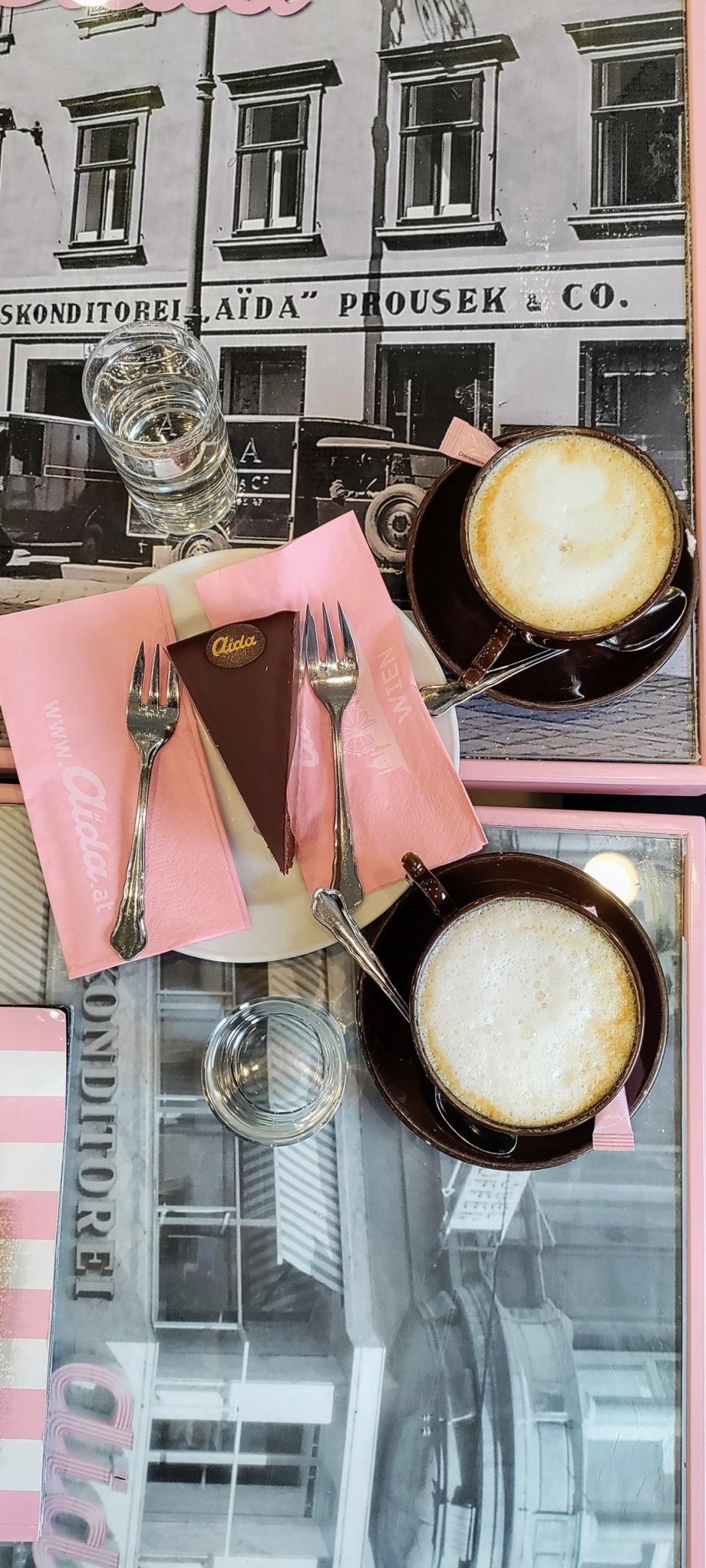 Odlétaly jsme v podvečer z Vídně s jednou z nízkonákladových společností a místa v letadle jsme získaly u okénka (daly jsme náhodný výběr a vyšlo i okénko). Na letišti jsme samozřejmě neodolaly a díky nasazenému režimu zvaném dovolená jsme zašly do letištní kavárny Aida. "Vídeňská atmosféra" byla pro náš začátek cesty ideální a proto jsme si objednaly kávu i Sacher dort. Na cenu se raději neptejte, protože byla poměrně vysoká, jak se patří ke správným letištním přirážkám. A jak s oblibou říkám "raději nepřepočítávat a užít si to".