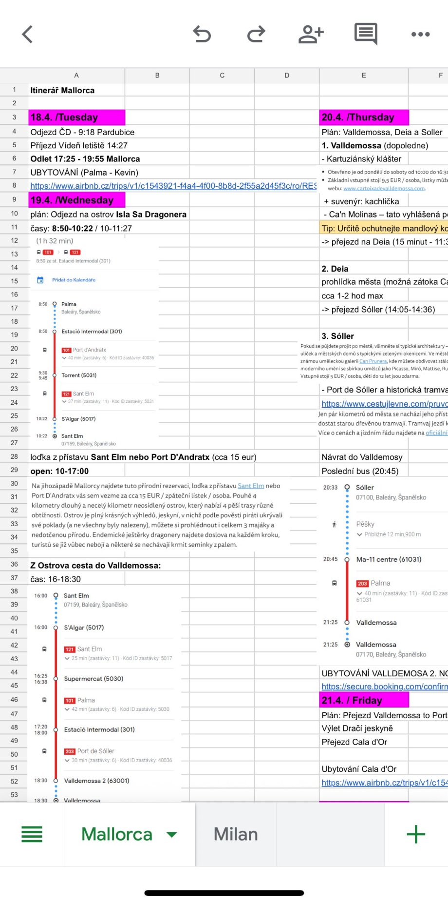 V dubnu 2023 jsme odjely s mojí nejlepší kamarádkou Maky na Mallorcu. Byl to vlastně takový spontánní výlet a obě jsme v tu dobu měly čas. Věděly jsme, že nechceme jet nikam moc daleko, ale zároveň někam, kde bude v dubnu teplo, abychom se mohly i případně vykoupat. Obě jsme tak trochu plánovací typy a pokud někam letíme, tak si dopředu uděláme průzkum toho, co všechno bychom chtěly navštívit (to doporučuji všem, co třeba letíte poprvé nebo někam, kde to neznáte). Proto jsme si sestavily předběžný itinerář naší cesty, který obsahoval dny odletu/příletu, ubytování, odkazy, trasy autobusu, apod. (Uklidním vás, když vám řeknu, že se stejně itinerář v průběhu cesty dost měnil?)