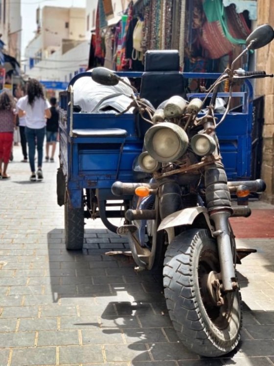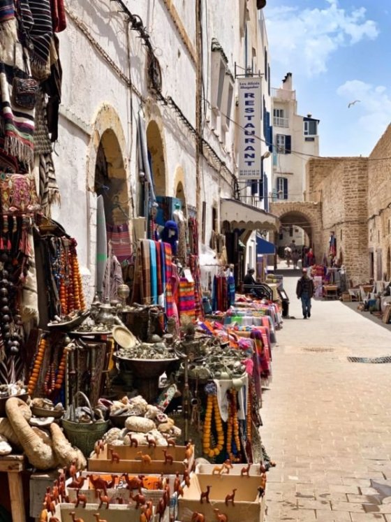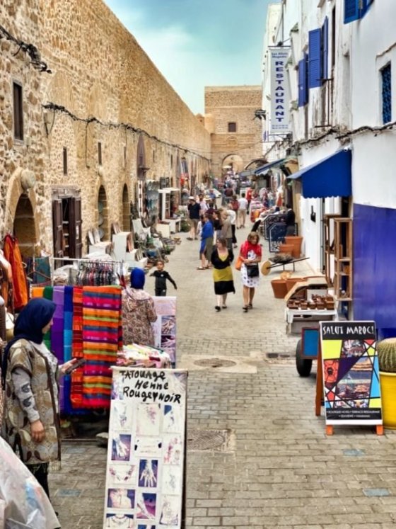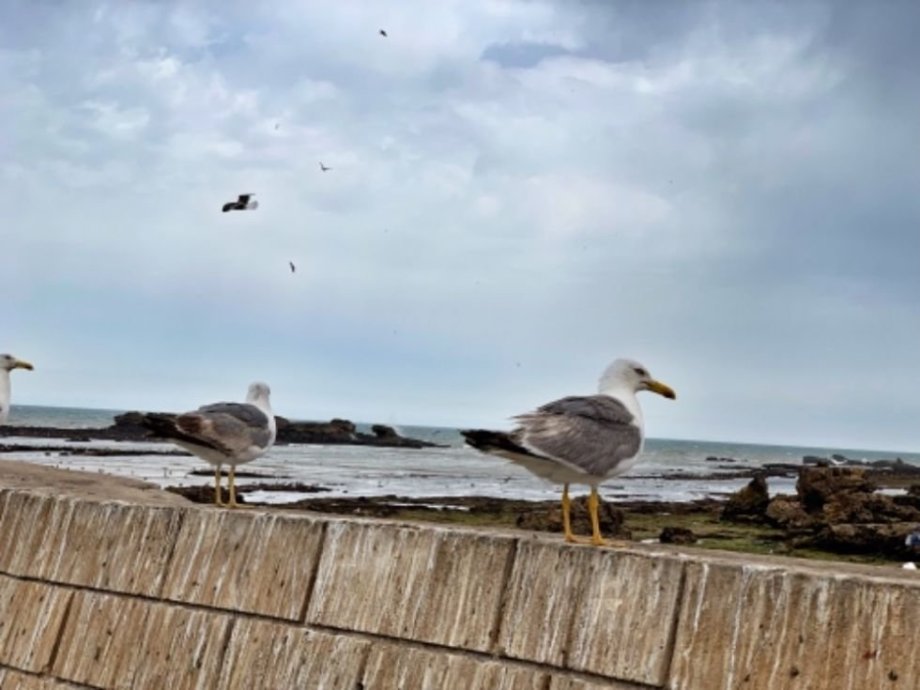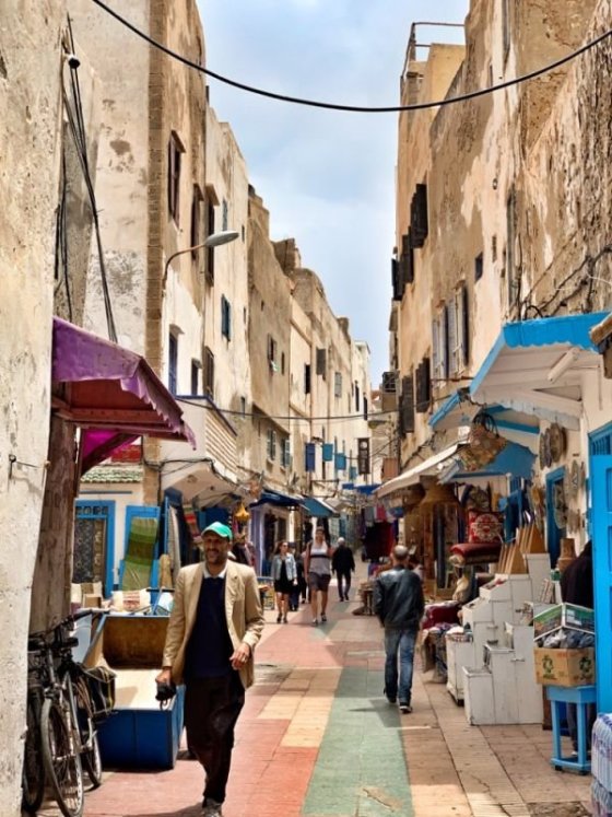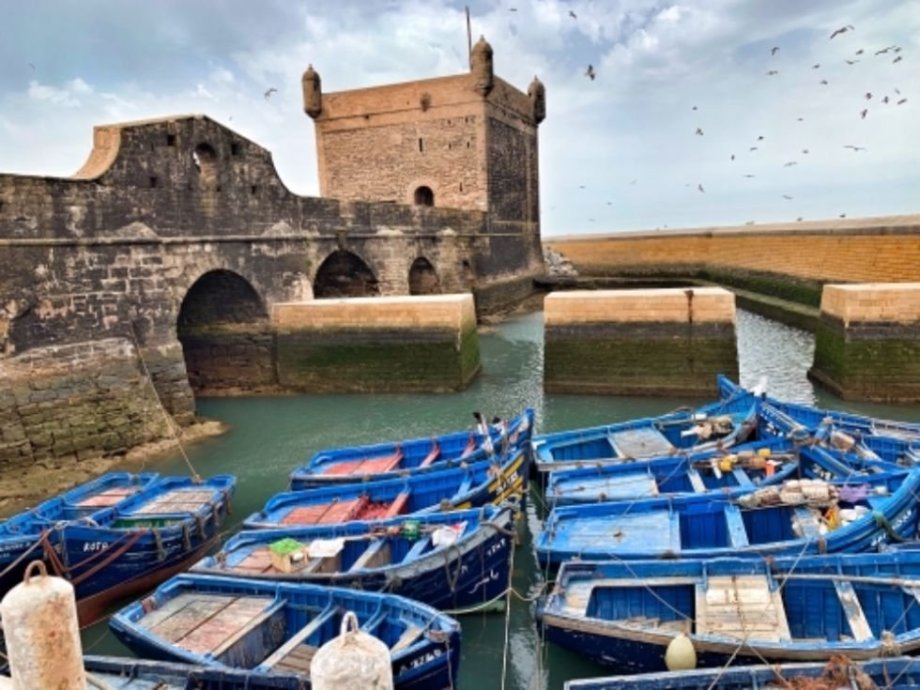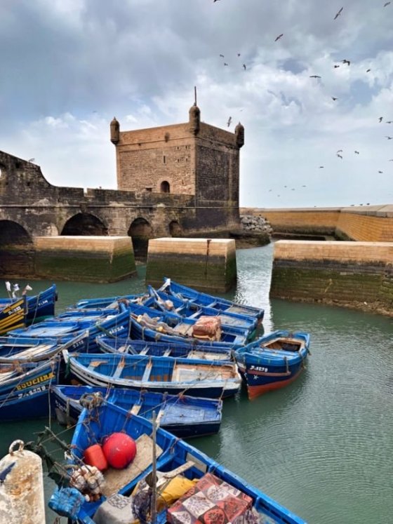 Cesta k moři je dlouhá. Hlavně moje kolena dost naříkají.. K ruptuře menisku v levém koleni, s kterým jsem od loňského léta neměla letecké volno na operační řešení, přibyla ruptura předního zkříženého vazu v koleni pravém a i když už to před cestou nebolelo tak jako v Kyjevě, tady v tom vanu koukám do pouště a představuju si nástup účinku nějaké silnější farmako-drogy. Nebo alespoň led vytažený z mrazáku a tři oanáky Finské.. Skoro v poledne jsme v cíli, přestože je to jen 200 km. Na silnici je mrak omezení rychlosti a ještě víc policejních hlídek, takže náš řidič jede ukázkově jak řidič v autoškole. Projíždíme pustinou, pouští a občas nějakou ospalou dírou. Cíl ale za ten otlačenej zadek a plačící kolena rozhodně stál! Vystupujeme z auta u hradeb přímořského městečka ESSAOUIRA, jsme nadšené z tyrkysového výhledu před námi...a je nám brutální zima! Oblečeme se do osušek a v začínajícím deštíku sypeme na místní rybí trh. Je to obrovský zážitek a nekazí ho ani vichřice a deštík s kapkami jak zralé třešně. Nejdřív si myslím, že po nás místní spratci házejí kameny, ale je to fakt déšť..