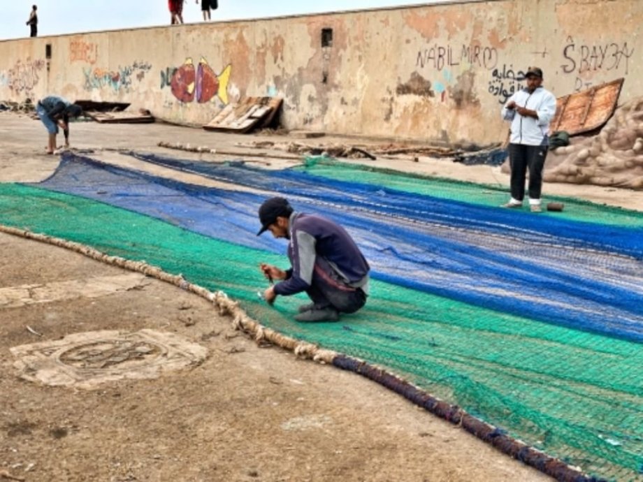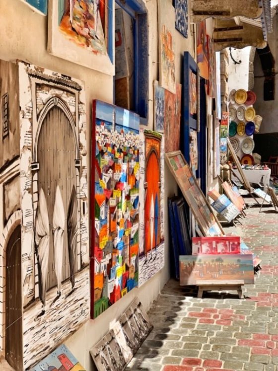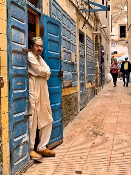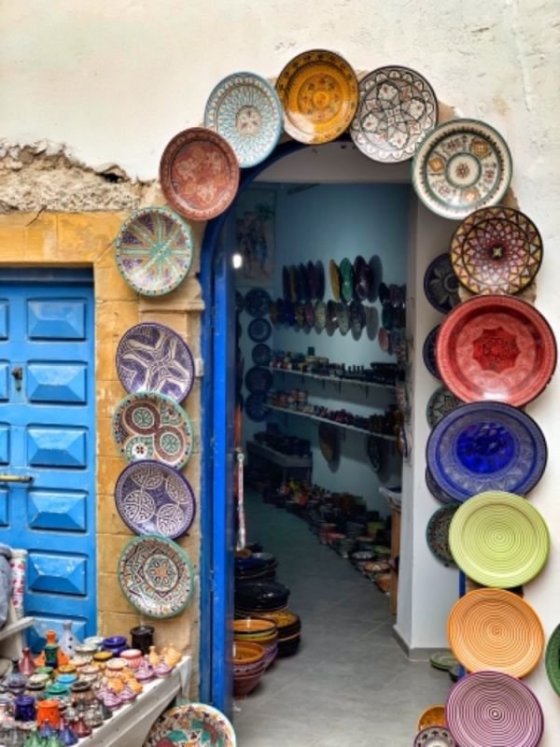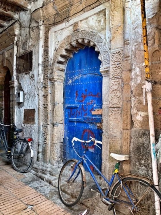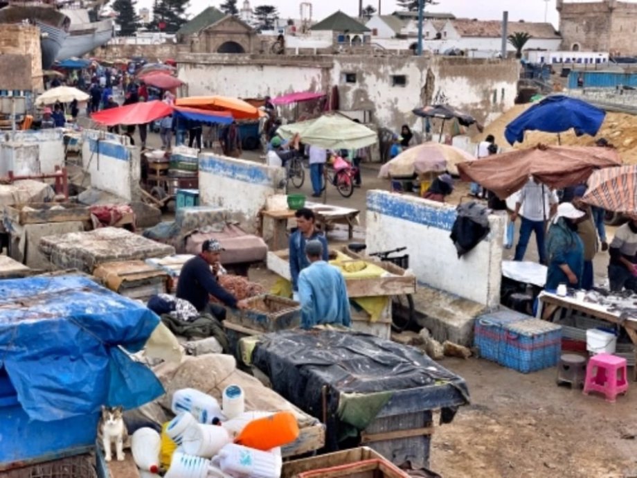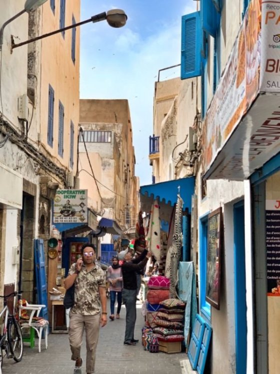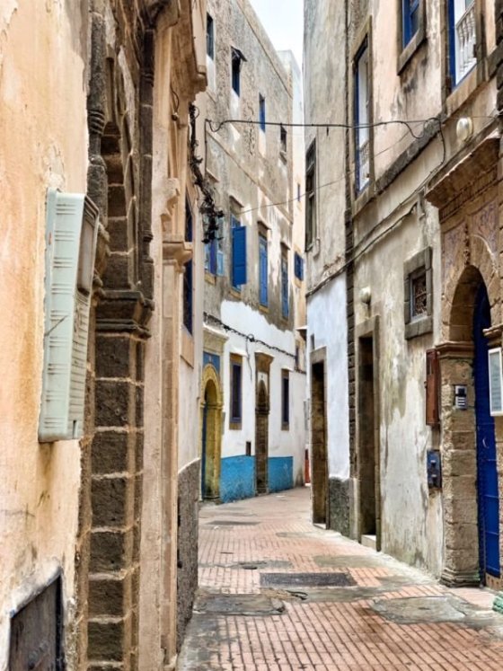 Cesta k moři je dlouhá. Hlavně moje kolena dost naříkají.. K ruptuře menisku v levém koleni, s kterým jsem od loňského léta neměla letecké volno na operační řešení, přibyla ruptura předního zkříženého vazu v koleni pravém a i když už to před cestou nebolelo tak jako v Kyjevě, tady v tom vanu koukám do pouště a představuju si nástup účinku nějaké silnější farmako-drogy. Nebo alespoň led vytažený z mrazáku a tři oanáky Finské.. Skoro v poledne jsme v cíli, přestože je to jen 200 km. Na silnici je mrak omezení rychlosti a ještě víc policejních hlídek, takže náš řidič jede ukázkově jak řidič v autoškole. Projíždíme pustinou, pouští a občas nějakou ospalou dírou. Cíl ale za ten otlačenej zadek a plačící kolena rozhodně stál! Vystupujeme z auta u hradeb přímořského městečka ESSAOUIRA, jsme nadšené z tyrkysového výhledu před námi...a je nám brutální zima! Oblečeme se do osušek a v začínajícím deštíku sypeme na místní rybí trh. Je to obrovský zážitek a nekazí ho ani vichřice a deštík s kapkami jak zralé třešně. Nejdřív si myslím, že po nás místní spratci házejí kameny, ale je to fakt déšť..