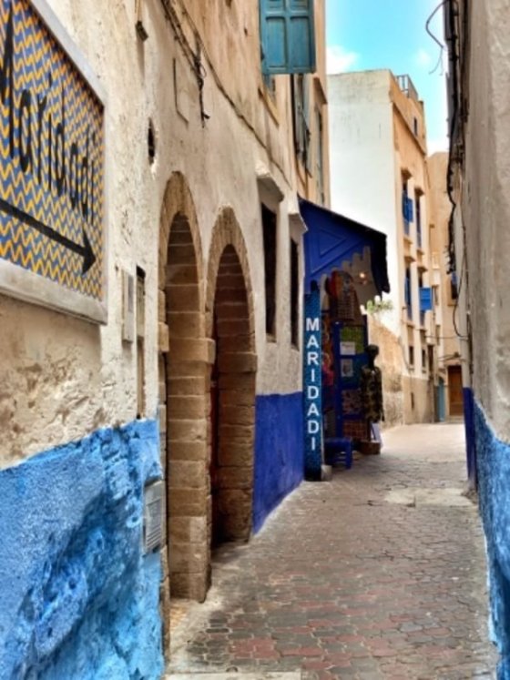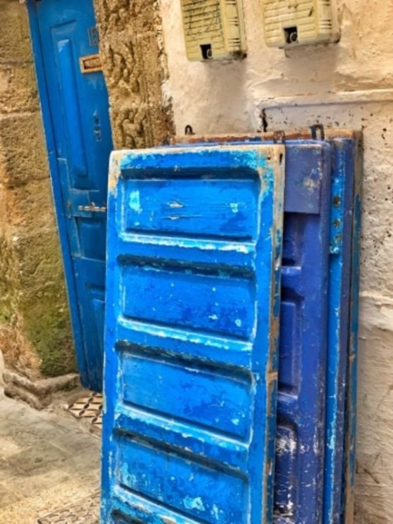 Stačí pár kroků a je mi jasné, proč je městečko zapsáno na seznamu UNESCO.. Kus modré nádhery na bílých zdech uprostřed marocké výhně. Milion uliček, jedna krásnější jak druhá! A ta modrá! To je prostě marocké Santorini! Spousta krámků, tržnic, barevných lidí - jak pletí, tak i oblečením, milion koček - narozdíl od Marakeše pěkně vykrmených, místy až neuvěřitelně tlusťounkých, vůně všelijakých dobrot.. Dlouho neodoláme a už se cpeme. Nejdřív dortíček z listového těsta s banánovým pudinkem, za chvilku papírový kornoutek plný smažených sardinek, krevet a rybiček všelijaké národnosti a věku (to nejvíc TOP, co jsem zde jedla!!), místní placky přímo z pece a samozřejmě mátový čaj z pohádkové konvičky. Právě u něj se počasí změní a ze zlověstných mraků a zimy je najednou vymetená obloha a teplo jak... v Maroku!