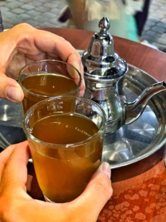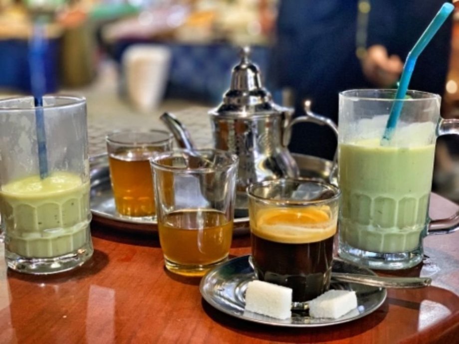 Nejúžasnější je ale relax v místní kavárně se sledováním všeho toho ruchu a dění kolem. Objednaly jsme si zde výborné avokádové smoothie, místní silnou kávu a hlavně naprosto luxusní “berberskou whisky”, což je skvěký (a extrémně sladký) mátový čaj. Sedíme na terásce vprostřed arabského ”mikrokosmu”, za pár hodin zde již otrlé skorodomorodkyně, srkáme mátový čaj (proložený hlty našeho finského jupíku), pohupujeme nohou do rytmu zvuků náměstí, odpočítáváme minuty do další chlapské mešitní svolávačky a já opět myslím na to, že jsem dnes v šest ráno nasedla do vlaku v Rájci…