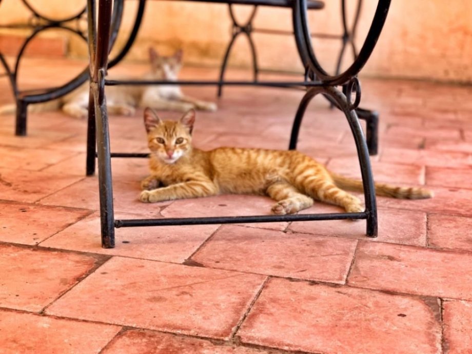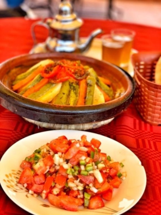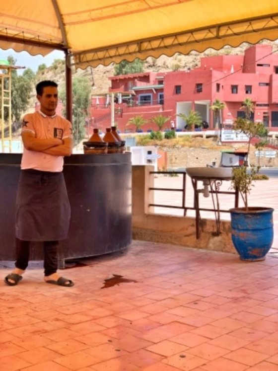 U zastávky busu jsme sedly do místní restaurace se zahrádkou a výhledem na jezero bez vody na oběd. Určitě nebudu daleko od pravdy, že hostina, kterou jsme zde za pár korun měly, byla tím nejvíc TOP z celého tripu! Je až neuvěřitelné, že jen hodinu jízdy od otravného a vlezlého Marakeše se všemi jeho naháněči je vesnice, kde jdete-li kolem restaurace, nikdo na vás nepokřikuje, netahá za ruce a nohy dovnitř, jen se na vás něžně usmívá a vy v tu chvíli víte, že ať je v těch keramických hrncích před číšníkem cokoli, tady se najíte opravdu s radostí a chutí. Vcházíme na zahrádku a sedáme ke stolu. Přichází číšník a místo menu karty mě zve nakouknout do hrnců a vybrat si očima a nosem.. Odklopí první keramickou pokličku a já cítím, jak mi tečou sliny z pusy! Nádhera! A ta vůně!! Nechceme už žádnou ovci ani nic podobného, tak beru vegetable variantu. Přesto tam pod hromadou zeleniny maso je a je luxusní. Celý obsah keramické nádoby je obdoba ratatouile a je to jedním slovem dokonalost! K tomu si dáváme čerstvý zeleninový salát, marockou placku a mátový čaj, kterej jsme si tu naprosto zamilovaly. Vedle u stolu zbylo po francouzské rodině mrak melounu a číšník nám ho s úsměvem u placení našeho účtu nabízí. Jelikož jej jí on i kuchař, neváháme a završíme gurmánský zážitek sladkou svěží tečkou. Po cizích lidech jsem v restauraci jídlo ještě nedojídala🙈, ale meloun byl skoro netnutknutý a taková laskavost se tady prostě neodmítá.. Platíme necelých sto korun na osobu, za meloun ani halíř (v Marakeši byste za takový “dáreček” daly dva své párové orgány), a to jsme z naší porce nakrmily ještě všechny místní kočky. Boží to bylo! Spokojené, najezené a odpočaté nasedáme do autobusu a vracíme se, dnes již podruhé, do Marakeše..