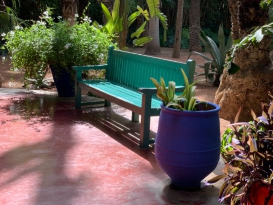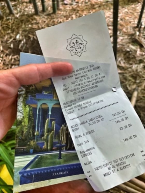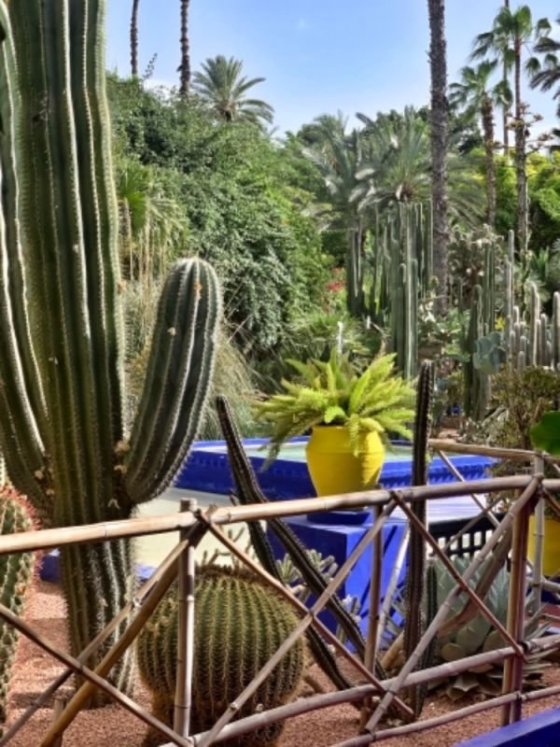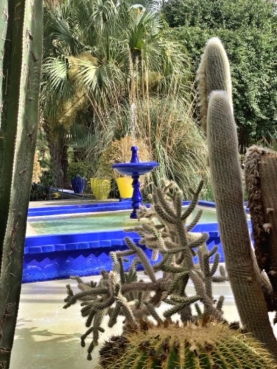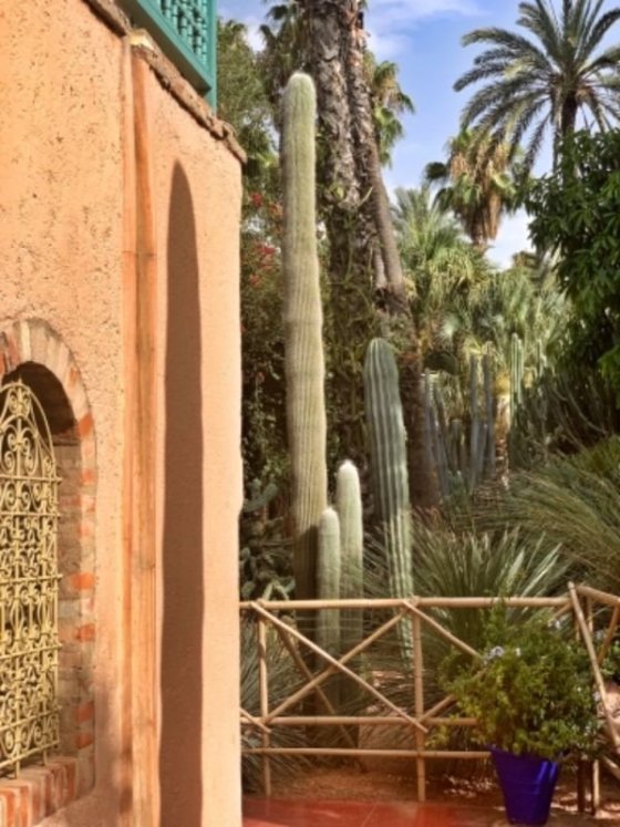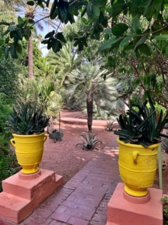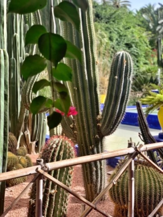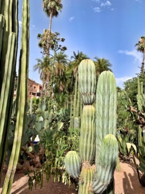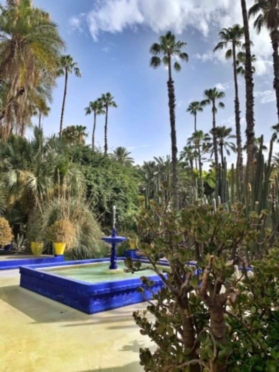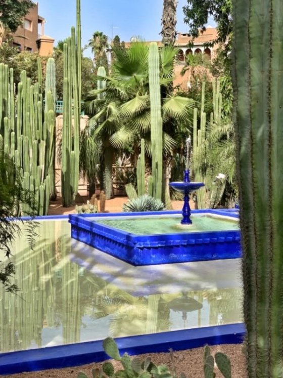 I přes to, že jsme moc nechodily, spíš si vozily zadky, jsme docela zničené. Asi i to vedro.. V ubytku jsem se ráno nášeho marockého boha ochoty zeptala na standardní cenu taxi po městě - 30 dirhamů - a tuto informaci nyní zúročíme. Po vylezení z busu u autobusáku stopujeme taxi k místní vyhlášené zahradě Majorelle Garden. Taxikář na nás zkouší 150 dirhamů, ale během vteřiny mu dojde, že jsme “skoro místní” a za 30 dirhamů nás vysazuje u zahrad i s výkladem a tipem, kde koupit (konečně!!!) alkohol…🍸