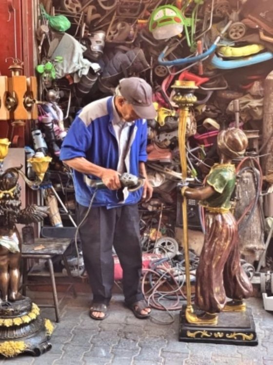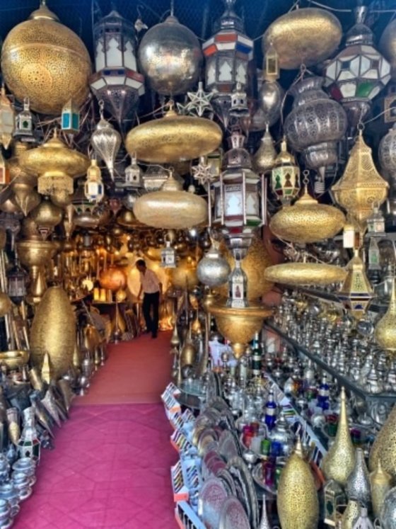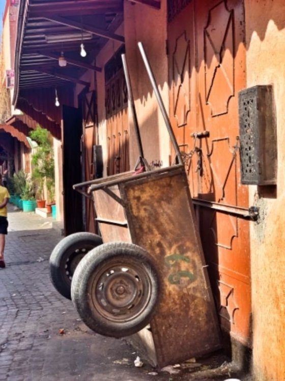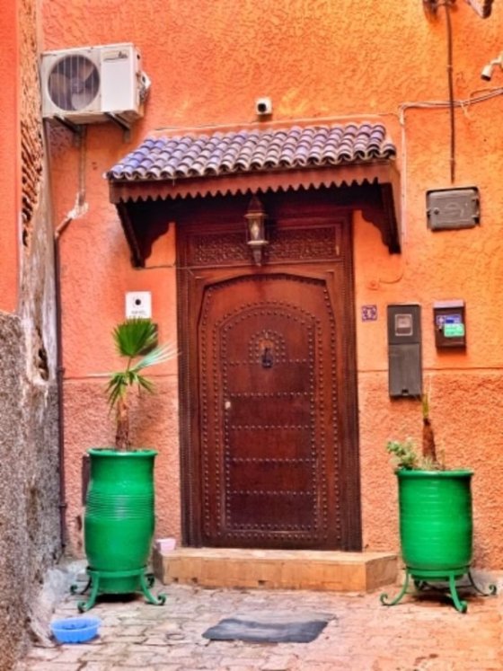 Vystupujeme v Medině, u nejznámějšího náměstí. Kulturní šok je o náš bágl na zádech větší. Je to jak nést v ruce transparent s nápisem “teď jsme přiletěli, pojďte nás obrat!” I tak nasazuji asijský poker face, Evču to učím za pochodu, a i s krosnou procházíme tržiště jak rodilé maročanky. Jsem paf ze všech lampiček, jak těch na svícení, tak těch s Aladiny. Taky z konviček a líně ležících koček💛 Všude harampádí, na které by se magor jako já vydržel koukat hodiny! Taky je ošahávat (je otázka vteřiny, kdy nějskej místní Aladin vyletí ) a dokolečka vydechovat slovo “nádhera!” Ale nic nekoupíme, hoši maročtí! To dáváme jasně znát. Přesto nás u každého stánku okupují jak mouchy v mojí kůlně mucholapku. Google mapy nás ženou do epicentra tohoto mumraje, v centru starodávné Mediny. Byly jsme fakt romantičky, když jsme brouzdaly na netu bookingem a vybraly si ubytko právě zde.. Nevadí, aspoň tu Marakeš nasajeme všemi smysly! Náš Riad, tak se ubytování v soukromí u místních označuje, najít nebude taková sranda, přestože je podle map “za rohem”... Samozřejmě jsme premedikované! Víme, že nám bude každý ochotně nabízet radu, jak se do ubytování dostat a pak chtít za tuto službičku nekřesťanské peníze.. Je to tak a my všech asi 150 zájemců o služby průvodce na 800 metrech chůze rázně odmítáme. Nejhorší, tj. nejvíc vytrvalé a agresivní, jsou místní děti, tak na ně bacha obzvlášť! Přestože děti miluju, tady jim (věkovka 5 -15 let) po první půlhodině, a to do konce našeho tripu, neřeknu jinak než smradi cikánský. A to nejsem rasista! Takový spratky jak tady jsem ještě nepotkala, a když vidím, jak mimo jejich agresivní chování odhodí každej obal z ruky na zem, musím se držet zuby nehty, abych jim přes ty jejich nevymáchaný držky nenabřinkala. Děs běs! Ubytko jsme našly a za krásnýma kovovovýma dveřma s klepátkem místo zvonku na nás čekal marocký bůh dobroty! Neskutečnej bytnej!! Pokojíček máme na střeše, v té největší výhni. Taky je malinkej a vůbec nevypadá jako z pohádky tisíce a jedné noci, jak jsme si vygooglily a myslely. WC s koupelnou je od pokoje oddělen závěsem a bazén, kvůli kterému jsme se pro tento riad rozhodly, je velikosti mojí vany a sedí u něj v době našeho příjezdu tři místní Šeherezády v burkách a asi deset dětí. Slibovaná vyhlídka ze střechy na Medinu je ve skutečnosti vyhlídka na další střechy, klimatizace, dráty a bordel. Ale vůbec nevadí! Bytnej nám to svým ochotným přístupem vynahrazuje celý pobyt - vaří nám boží snídaně, nechá nám chladit ve své arabské NONalcoholic lednici naše víno, tiskne boarding pasy na cestu domů, otvírá kovové vrata dřív, než na ně po úmorných toulkách zaklepeme a já už první den tomuto místu říkám DOMA a vím, že na tohle ubytko budu s láskou vzpomínat 💛