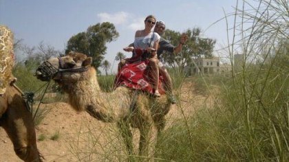 Typické muslimské hlaholení z věže nás vyžene z postele. Po cestě na snídani se stavujeme na recepci a domlouváme si půl denní výlet za velbloudy. V 10 nás vyzvedává jeep a veze nás na velbloudí farmu za městem. Malý berberský velbloudář nám ukazuje našeho camela, pak nás na něj vysazuje a ještě než půjdeme na procházku, vytahuje zpod pláště mobil a vyřizuje si hovor. To je úsměvné. Dnes už je mobilní signál snad i na Sahaře. Nasazujeme rychlé tempo a asi po kilometru doklusáváme karavanu dalších asi 6ti kousků s turistama na hrbu. Společně karavana zastavuje až u řeky. Snažíme se zpozorovat plameňáky, fotíme a velbloudi nabírají sílu na cestu zpět. Po chvilce se opět s divokým pohybem i s námi na zádech velbloud zvedá. Náš vodič vyhecuje závod a s pokřikem 'Abibí,Abibí' (miláček) jasně vítězíme tento sprint. Pak už zpomalujeme a užíváme si pouště a hodinový pochod zpět na farmu. Poslechneme si ještě několik berberských písní a za bakšiš spokojeně farmu opouštíme. Vracíme se a je dobrý čas. Dneska tedy stihneme ty duny. Džejn se moc nechce, ale přemluvím ji. Možná tomu pomohla i zakoupená láhev vína :-) Jdeme podél pobřeží. Kousek od plné pláže jsem spatřil asi 200 metrů od břehu útesy vyčnívající z vody. Já tam vlézt prostě musím. Janina mi to rozmlouvá, už je z mojí akčnosti zřejmě docela otrávená. Tentokrát měla asi pravdu, že se na to mám vysrat. Slunce na ústupu a s tím spojený příliv prodloužil oněch 200 metrů ve vodě maximálně po ramena na cca 300 metrů v hluboké a neklidné vodě. Na kameny jsem vylezl, zamával do foťáku na břeh a zpět už jsem se ve vlnách zmítal o poznání hůř. Celkově riskantní akci na půl hodiny sledoval ze břehu nějaký týpek, který mě po tom co jsem vylezl z vody, razantně upozornil na ceduli, která zde vstup do oceánu zakazuje. Tak ale chtěl jsem to, mám to. Dojdeme další kilometr ve vlnách až k písečným dunám mezi resorty. Vybíhám první a zapadá slunce, když otevírám víno a oba usedáváme do písku. Chvíli na sebe necháme vítr foukat písek a upíjíme víno, než nás zpoza plotu vyhazuje strážný od kousek vzdáleného královského paláce. Zpět do hotelu jedeme taxíkem a po koupeli ulehneme k poslední noci.