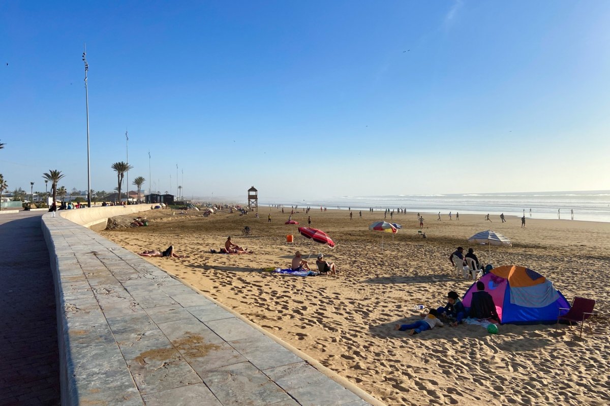 Přesouvám se na nedaleké parkoviště k pláži vedle vstupu č. 6. Za parkování tu chtějí 5 MAD, případně nabízí za 20 drobáků umytí. Počasí vychází naprosto luxusně (25°C a jasno), tak se rozvalím na pláži a odpočívám až do pozdního oběda. Na jídlo jdu prakticky hned vedle. Restaurant Le Nil Bleu tu byl zmíněný i jiném cestopise. Je tu dost plno, jídlo je zde dobré a jde jim to rychle od ruky. Bohužel mám ale smůlu na obsluhu s jazykovou bariérou a horší chápavostí. Tím se ta pohoda a spokojenost trochu kazí, ale dopadlo to docela dobře.