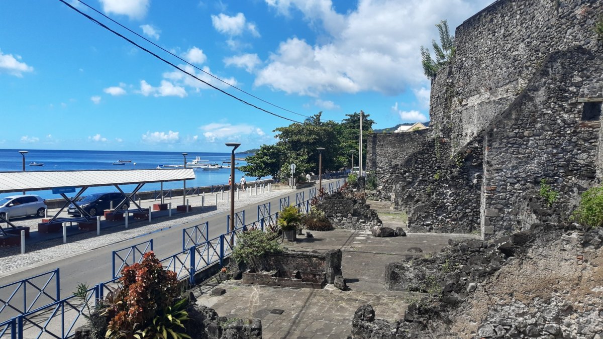 A právě zbytky původního města, zničeného výbuchem sopky, jsou místními památkami. Ať už se jedná o zbytky bloku domů na nábřeží nebo trosky původního velkého divadla nedaleko vulkanologického muzea. Dominantou města se spletí původních uliček je katedrále, která je zřejmě na začátku dlouhé a náročné rekonstrukce. Město leží přímo u moře v mírném oblouku zátoky, kolem písečné pláže. A na té, opět téměř prázdné, s pohodovým koupáním ve vodě teplé jako kafe, trávíme zbytek odpoledne.