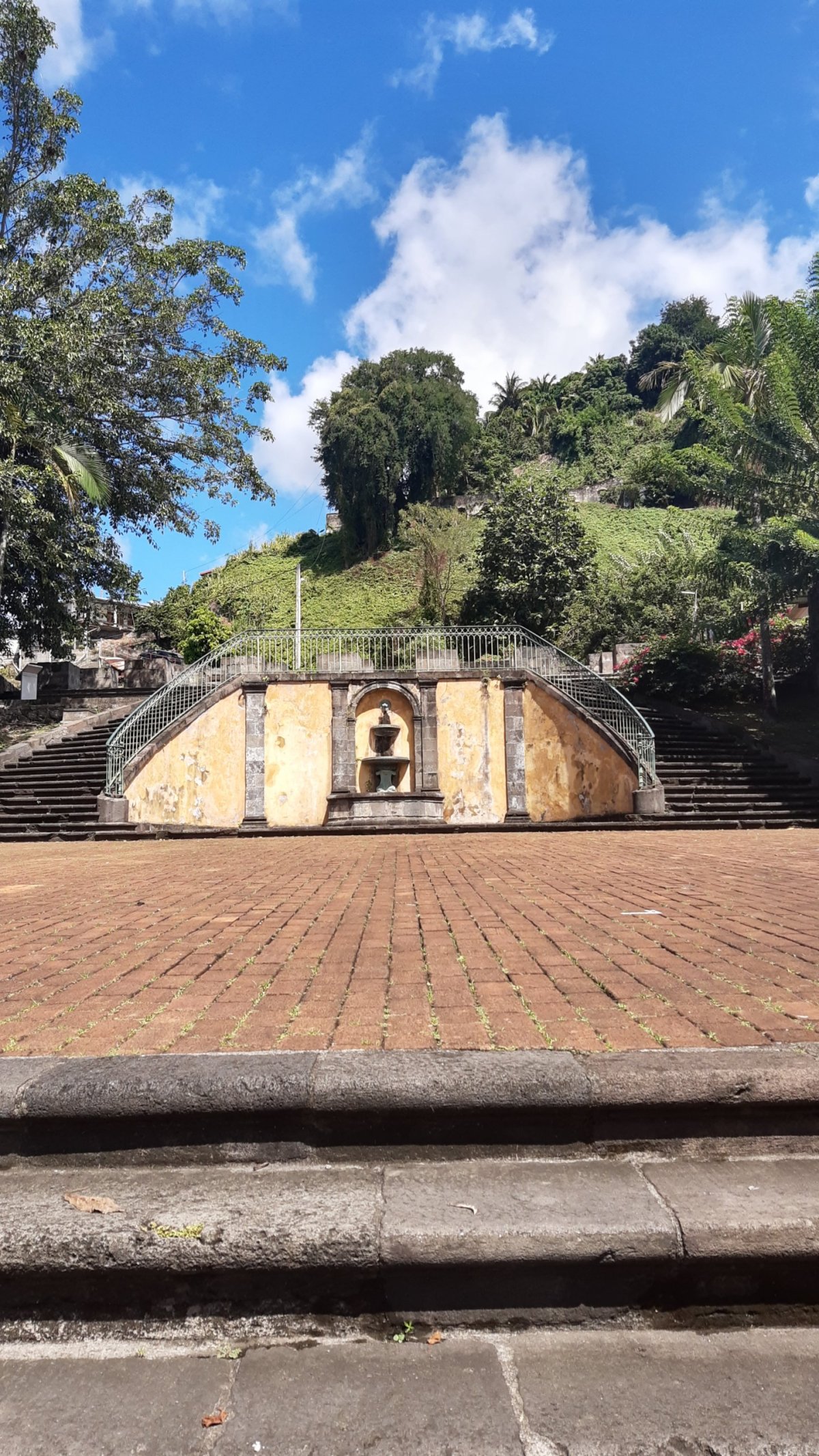 Naším dalším cílem výjezd na sopku Pelée, kam zhruba do výšky 850 m n.m. vede asfaltka a cestou nahoru se otvírají nádherné pohledy na všechny strany. Bohužel nahoře, na malém parkovišti, odkud lze dál pokračovat pěšky na vrchol, se již ocitáme v mracích, teplota je tak o 10 stupňů níž než na pobřeží a k tomu navíc mírně prší. Proto hned zase sjíždíme do Le Morne-Rouge, městečka na náhorní plošině pod sopkou, kde si procházíme poloprázdné centrum s kostelem i moderním dominantním náměstím.