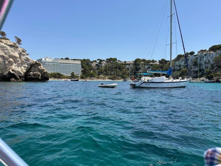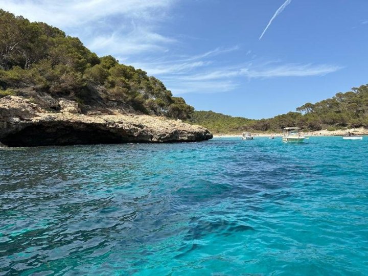 Začali jsme v letovisku Cala Galdana. Určitě je to jedno z těch velkých, v místních poměrech. Na Menorce se totiž nesmí stavět budovy vyšší než 3 patra, tady ještě někde z osmdesátek pár vyšších hotelů stojí. Rozhodně tohle bylo to nejrušnější místo z celé dovolené. Ale nebudeme tu trávit celý den, jen dopoledne, protože půjčení máme na odpoledne. Půjčení člunu šlo raz dva a vyrážíme. Prvních pár vlnek jsem se bála, že nás to otočí, ale po chvilce je ze mě už ostřílená mořská vlčice. Teda v mém případě spíš mořská vačice 🤣 Za ty 4 hodiny se dá objet poměrně dost z jižního pobřeží, my jsme stihli tak polovinu, ale o to víc času jsme tam strávili. Teda já v té vodě. Jako první míříme na Cala Mitjana (tam prostě Janča musí) a hned vedle ní Cala Mitjaneta. Tam si vyzkouším hupsnutí z lodi a nález zase zpět. Pak se vydáme na Cala Trebalúger - za mě naprosto hidden gem. Zatímco třeba Cala Galdana, Mitjana, Mitjaneta, Cala Macarella + Macarelleta (kterými končíme náš exkurz) jsou v každém průvodci, tahle není tolik známá a kvůli obtížnější dostupnosti na souši zde ani není tolik lidí. Krásná, za mě naprosto krásná. Přísahám že i ta voda byla jemnější. Tady jsem se placatěla dost dlouho, i jsem doplavala až na pláž prostě krása. Ani se nebudu rozepisovat o všech odstínech modré za tento den. Prostě wow.
