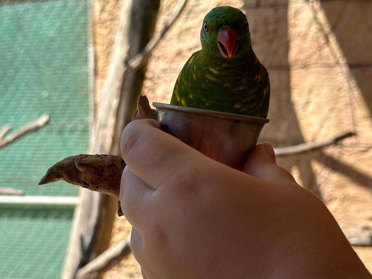 Sahat a krmit je zde ale dovoleno u jiných zvířat. Jak jsem již zmínila, dětská zoo s domácími zvířátky, ale také trochu exotičtější a to krmení papoušků v jejich volné voliéře. Krmení dostanete od chovatelů nadávkované v kovové misce a papoušci neodolají. Pak se plynule můžete vydat na volné prostranství mezi výběhy, kam chovatelé vyndají pár vybraných hadů (od nejmenších po fakt velké, že je možné si udělat foto á la Britney). Já jsem se odvážila na malou korálovku a hada viz foto. Hadi jsou tam takto k vidění a podržení asi 2 hodiny. Snad žádný neutekl.