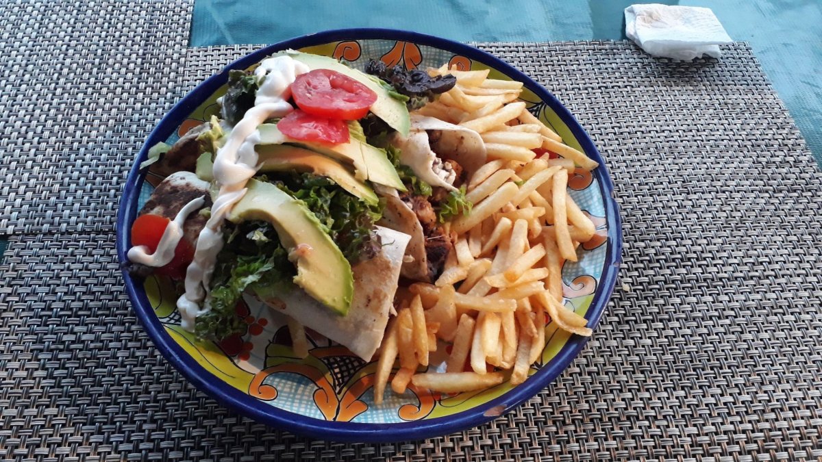 Večeři již tradičně lovíme na hlavní třídě v Playe. Zalézáme do místňácký restaurace vyšší třídy (rozuměj místo plastových CocaCola židlí dřevěné židle a ubrus), dostáváme menu ve španělštině a náhodně vybíráme od každého něco. Burrito výborný, fajitas úžasný, quesadilla s chorizem - nebe v hubě :).