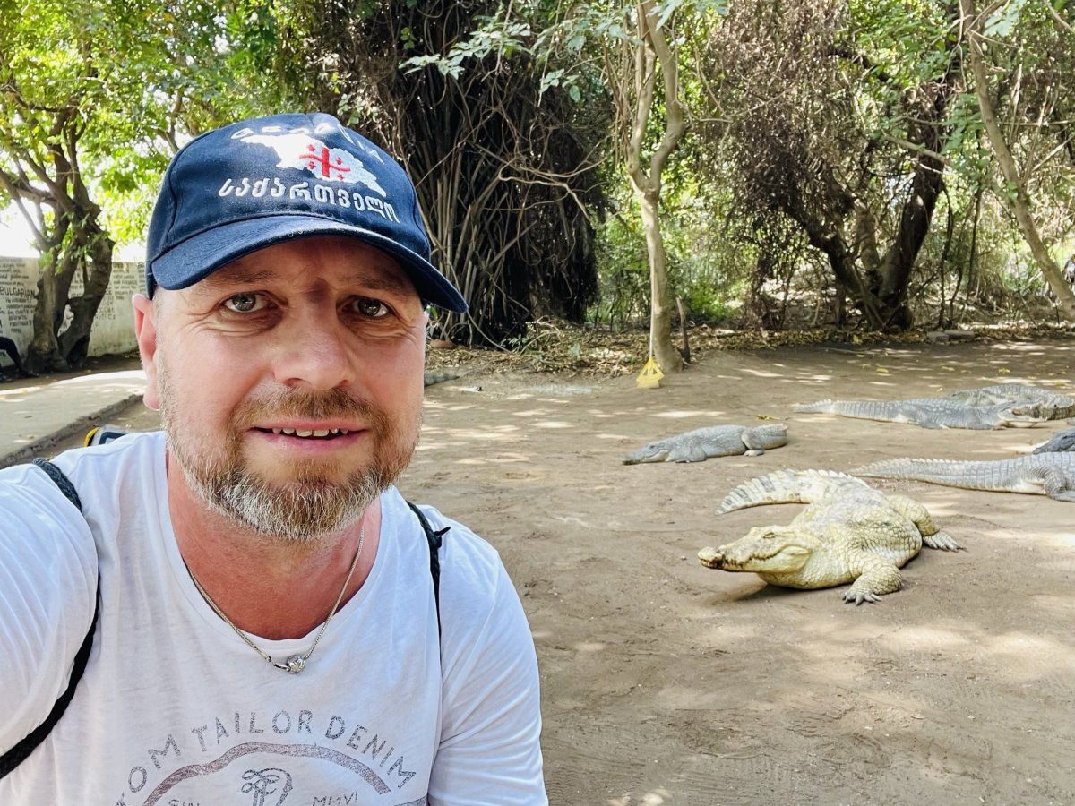 Zlatým hřebem Bakau jsou ovšem krokodýli. Kachikally Crodile Pool je totiž místo, kam hotely vozí svoje turisty. Ti si udělají pár fotek a jedou zpět. Nic pro mě. Trávím tu tři hodiny a za tu dobu jsem si vybudoval slušnou pozici. Místní průvodci tu kromě opic totiž v rybníku a přilehlém okolí hlídají více než čtyři desítky krokodýlů volně se zde pohybující. I když jich je půlka ve vodě, kde připomínají plovoucí kládu, další jsou na břehu a je možný chodit přímo mezi nimi na což si prakticky nikdo z turistů samozřejmě netroufá. Místní mě však uklidňují, že jsou po jídle a pokud nebudu dělat nějaký trhavý pohyby nebo o ně nezakopnu a nespadnu jim přímo před chřtán, nemám se čeho bát. Úplně mě však přesvědčí až tvrzením, že český maso jim nechutná, neboť prý preferují Poláky nebo Němce. Nabízím jim, že bych jim dohodil jednoho Slováka snažícího se ovládnou Česko, ale s díky odmítají, že i krokodýlům by se z něj udělalo špatně...