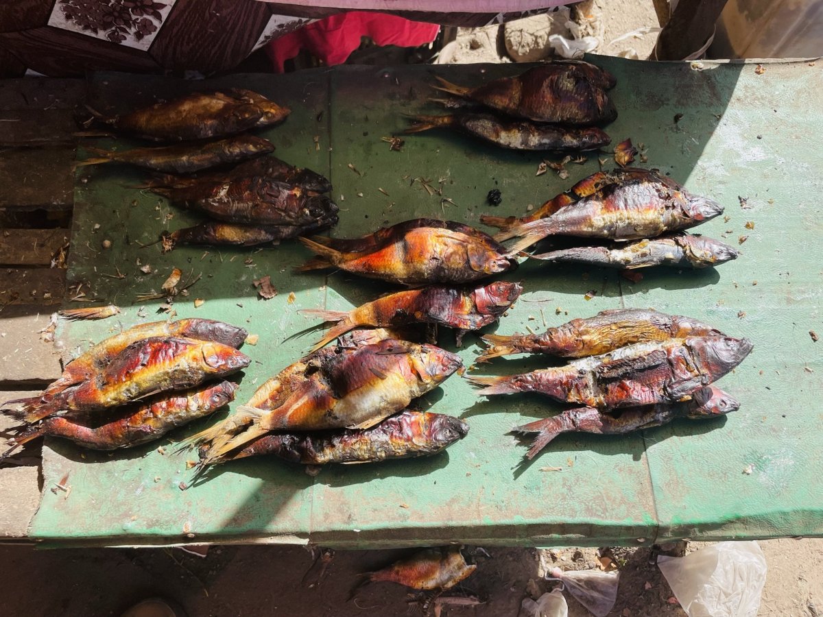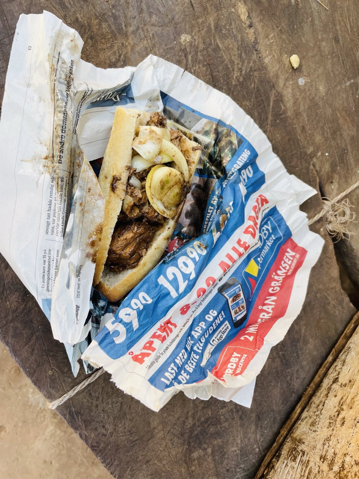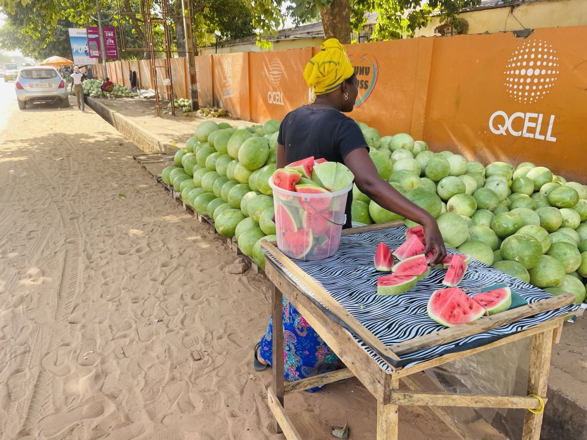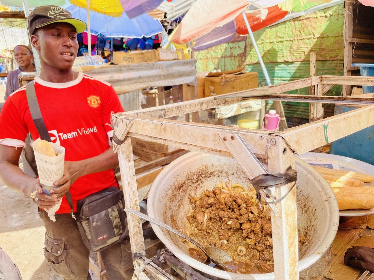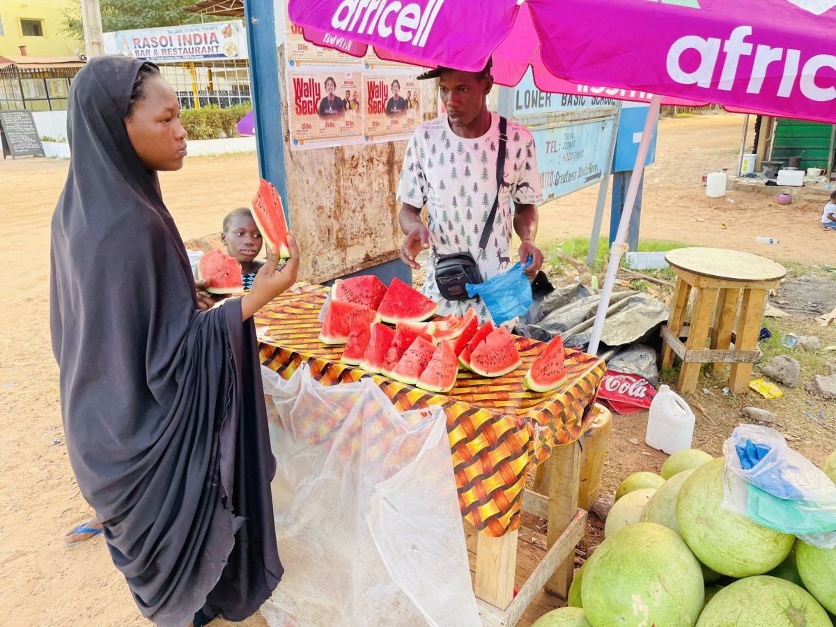 Kromě zcela monotónní snídaně v mém guest housu skládající se z omelety a kusu chleba jím pokaždý v Gambii na ulici. A to doslova. Sice první dva dny večeřím v tureckým bistru dost velký hamburger za 200 dalasi ( 70 Kč). Ale ty následující obědvám, svačím i večeřím na ulici. A to v době, kdy jsem si z Čech přivezl pořádně rozhašený žaludek . Maso v syrovém stavu v boudách u silnice v třicetistupňovým horku vypadá hóóódně odpudivě, ale tepelně zpracovaný mi ve střevech žádnou paseku nenadělá. Zaujal mě i jeho prodej, ke každému kilu je potřeba připočíst ještě 10 deka much. Úplně stejný je to s rybama. Vlastně ryby plus mouchy. Že je ovoce úplně jiný chuti než u nás, to je asi tak jasný jako, že Prahou protéká Vltava. Naprosto top je však místní zmrzlina. V igelitových sáčcích prodávané ovocné ledové tříště. Stačí jen ukousnout růžek a cumlat. A myslet při tom na něco hezkýho... A to jsem dostal ještě několik pozvání ke společnému muslimskému stolování, které spočívá v tom, že sejde 5 -20 lidí okolo nádoby masa s rýží a pravou rukou ( levá je nečistá) si uhněteš kuličku a jíš.