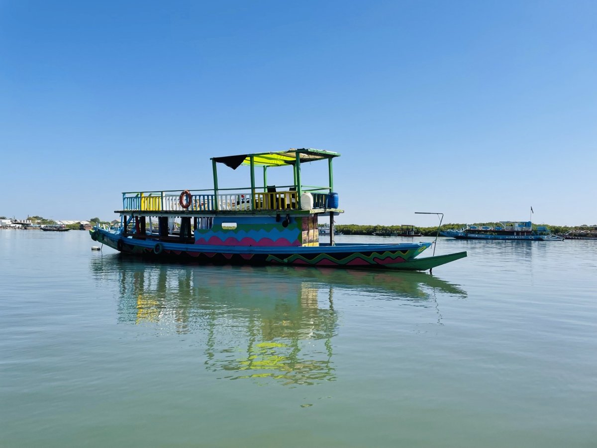 V Serekundě ( líp se to píše než říká) je mým oblíbeným místem (tržnice=křižovatka=něco jako autobusák) Westfield, centrum dopravy, jídla a pozorování Gambijců. Původně jsem se chtěl lodí dostat po řece do vnitrozemí na ostrov Kunta Kinteh ( s pevností), ale nikdo mi nebyl schopný věrohodně říct, odkud se vyplouvá . Vydávám se tedy k mangrovům při ústí řeky Gambie do Atlantiku. Takhle, cestovní ruch je v Gambii úplně v plenkách tak neočekávejte jakoukoli propagaci a vše je potřeba si nějak najít a vykomunikovat. Plavba po řece je určitě zajímavá, cena se dá usmlouvat. Vůbec žádný turisti tam po vlastní ose nepřijdou, jen ty hotelový s odvozem.