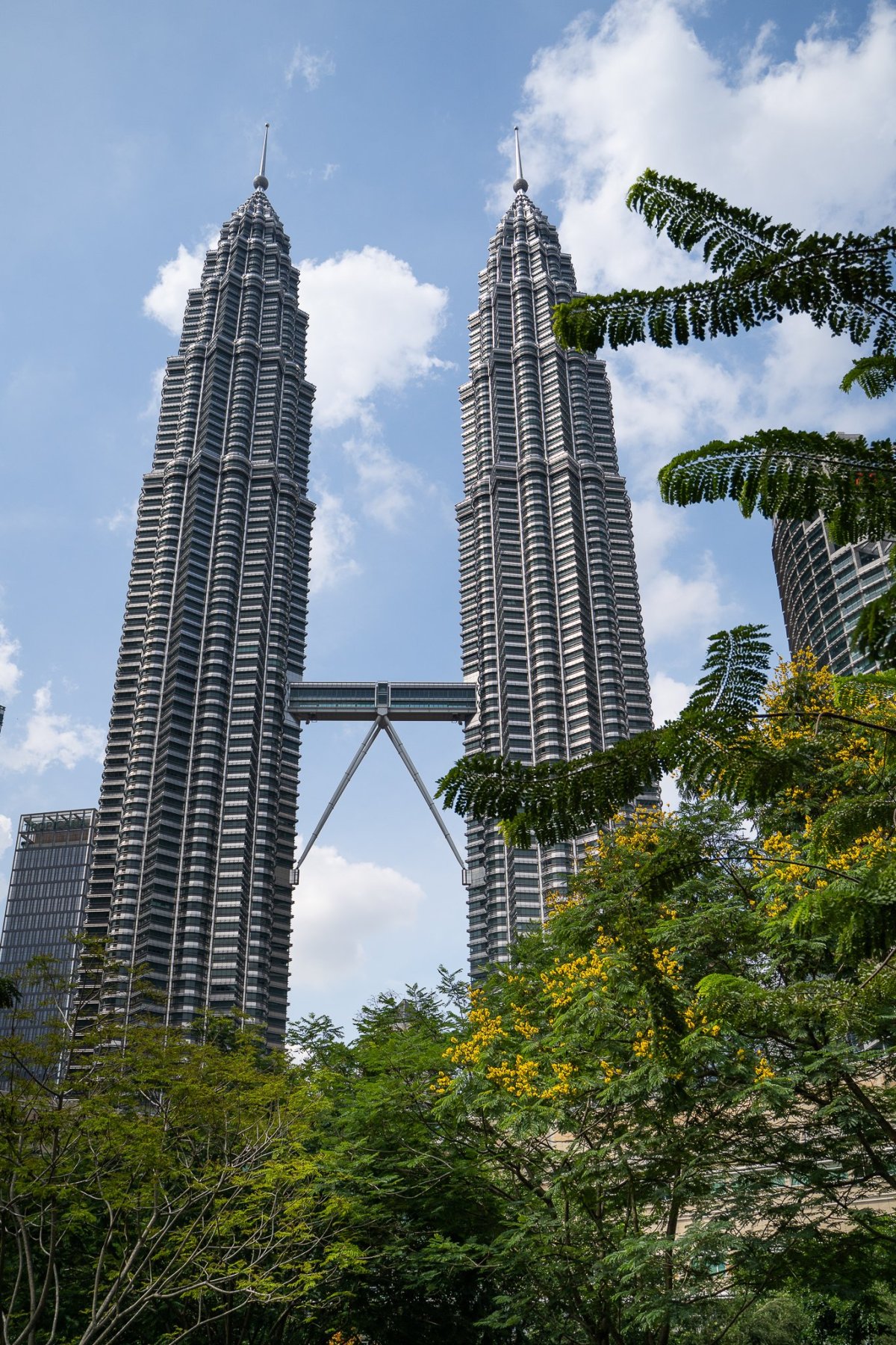 Přes appku volám grab, kterej nás odveze kousek od našeho ubytování. když se trochu refreshneme, dalším grabem se přiblížíme k Petronas Towers – svýho času (v 90. letech) nejvyšší budovy světa, který jsou ikonou města. Dá se koupit i výtah na vyhlídku, ale to vynecháváme, projdeme si okolní park.