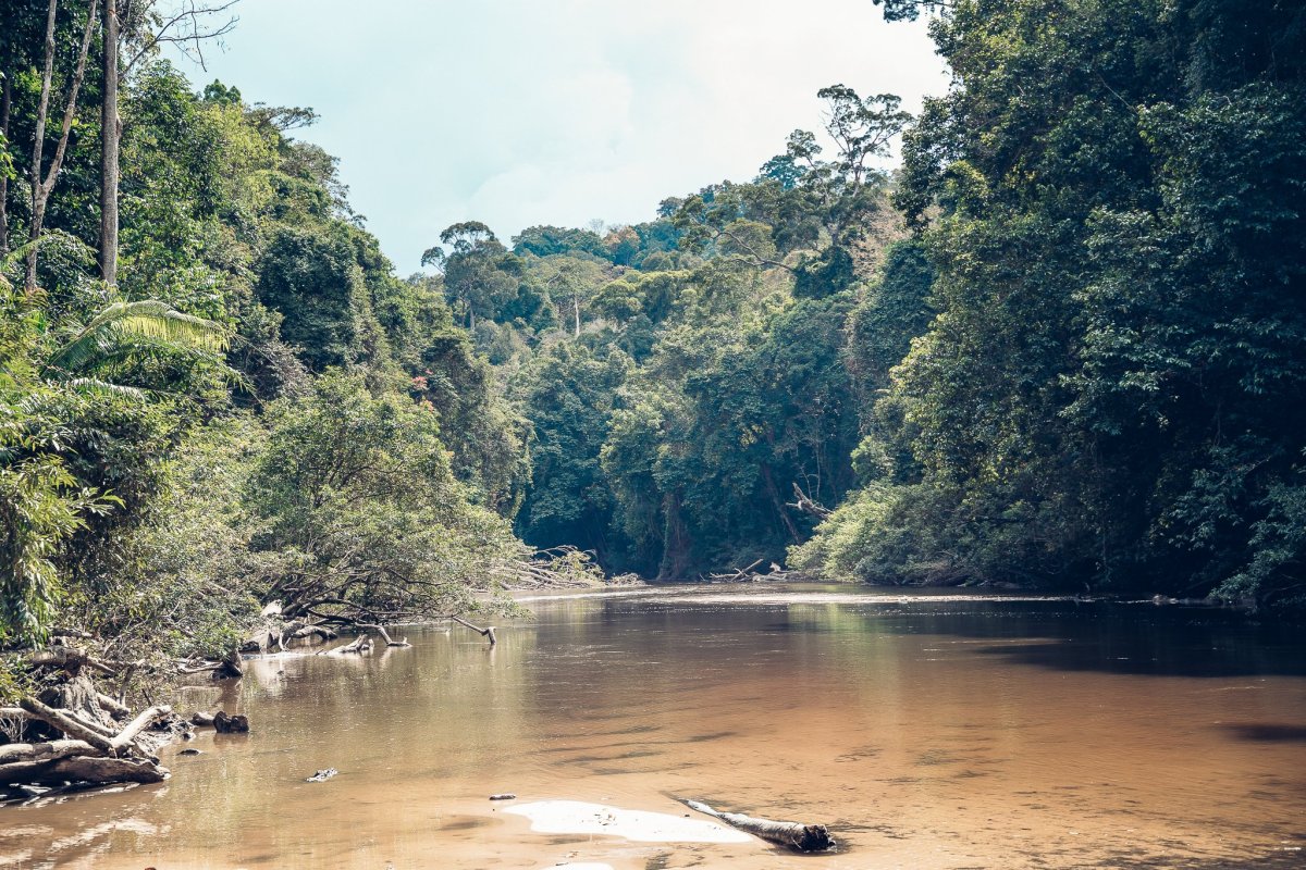 Vydáváme se dolů k řece, na místo, odkud vás za symbolický jeden ringgit převozník přepraví na druhou stranu břehu, kde je správa i vstup do parku. Na řece je taky několik plovoucích restaurací, kde si za pár korun dopřejeme smaženou rýži a mořský plody, kafe, já na internetu přečtu několik článků o tom, jak se zbavit pijavic, protože tady to je skoro loženka - a hurá do parku. Na začátek se musí vyplnit formulář a zaplatit za všechny zařízení s foťákem, jinak se vstup neplatí. Místy jsou dřevěné chodníčky a místy jen hlína a kořeny (všechny kořeny vypadaj jako hadi). Rozhodneme se pro jeden okruh, vše je dobře značený. Po cestě nás chytne parádní slejvák, ale v tom horku a dusnu nás to nijak netrápí. Příroda je tu dokonalá, připadáme si trochu jak v Cestě do pravěku. Snažíme se rozeznat alespoň některý ze zvuků, co slyšíme. Jinak tu žijou sloni, tygři, nosorožci a dalších přibližně 200 druhů savců, ale krom opic a veverek se drží daleko v srdci džungle, takže žádné větší překvapení nehrozí. Jsou tu obří stromy, obří kapradí a něco jako lopuchy, “sloní uši”.