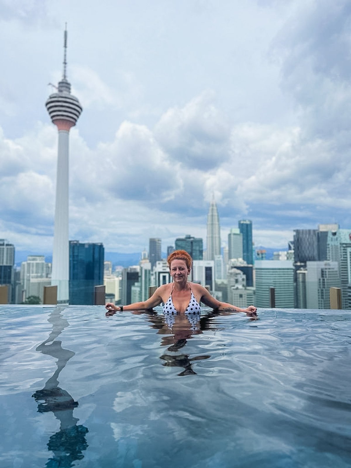 Jelikož v průvodci psali, že ubytování se střešním nekonečným bazénem je povinnost, rozhodla jsem držet instrukcí 🙂. Elis jsem to dala k narozeninám jako dárek. Ubytování Ceylonz Suites je 39 pater vysokej hotel s apartmány – náš je opravdu krásnej, s výhledem na Petronas Towers i televizní věž. V bazénu je překvapivě prázdno, výhled je skvělej. Vyžene nás až hlad, rozhodneme se ho zahnat v naší už známé Jalan Alor street food uličce. Následuje návštěva Chinatownu, kde smlouváme jak o život nejen suvenýry, ale i kabelku a boty. Možná překvapujícím faktem je, že ve stáncích prodávají většinou Indové.