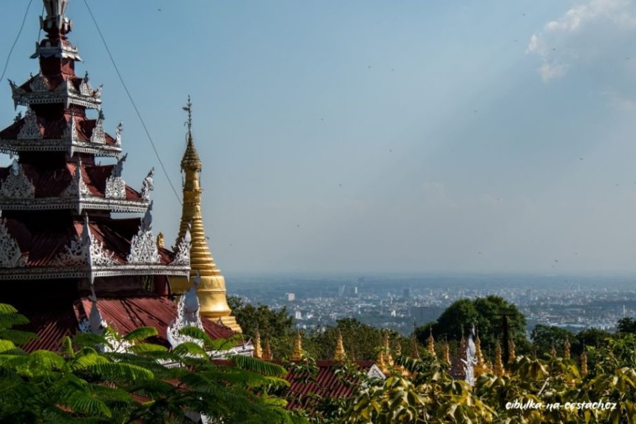 Asi 150 výškových metrů nad okolním terénem se nachází pagoda, cestou nahoru je možné si prohlédnout celou řadu dalších staveb. Boty si musíme nechat dole, nahoru se jde po schodech a až úplně na vrcholu se platí drobné vstupné. Na jedné straně je výhled na město Mandalay, na straně opačné pak na krásně zelenou krajinu s horami v pozadí. Krásný je údajně i západ slunce nad řekou Iravádí. My se ale chystáme si západ slunce vychutnat někde jinde. A tak po společné fotografii s místními, pro které jsme stále něco zvláštního, jdeme zpět dolů a hledáme způsob, jak se dopravit k mostu U-Bein.