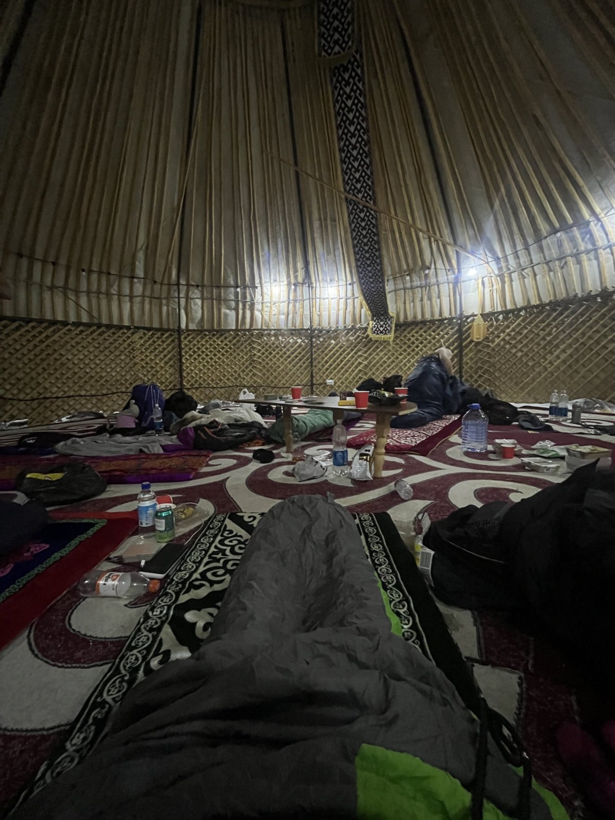 Spacáky je lepší mít vlastní, karimatky na místě jsou. Spí se na zemi a krom toho má naše jurta už jenom dva viklavé stoly. Záchody jsou jen v hlavní budově u lanovky a ve 20:00 zavírají. Co se týče teploty, asi hodinu až dvě trvalo než se jurta vytopila, ale pak to bylo klidně na tričko.