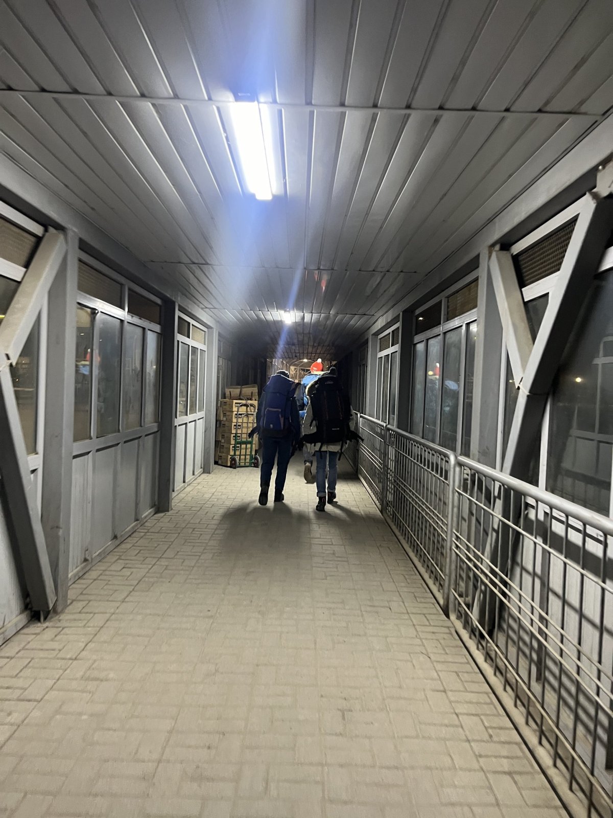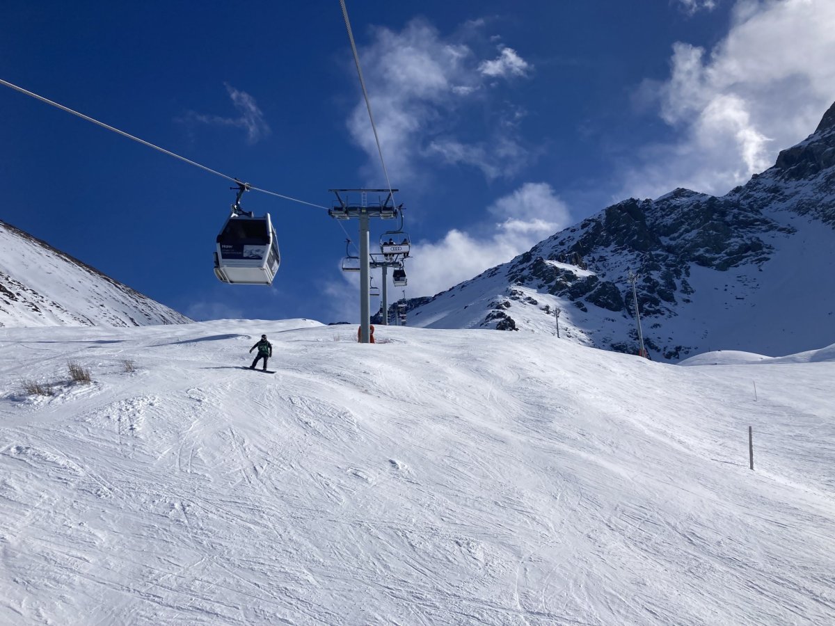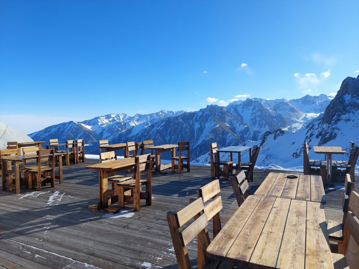 Cesty nahoru lanovkou jsem se trochu bál, protože sedačková lanovka s 60l krosnami není nic pohodlného, navíc je zima a my s sebou máme i barel vody, protože překvapivě v 3 200 m n. m. vodovody nevedou. Zachraňuje nás sovětská vymoženost, a to kombinace kabinkové a sedačkové lanovky, takže si prostě jen stačí počkat na kabinku. S jedním přestupem v asi 2 800 m n. m. to stíháme tak tak, než skončí provoz lanovky.