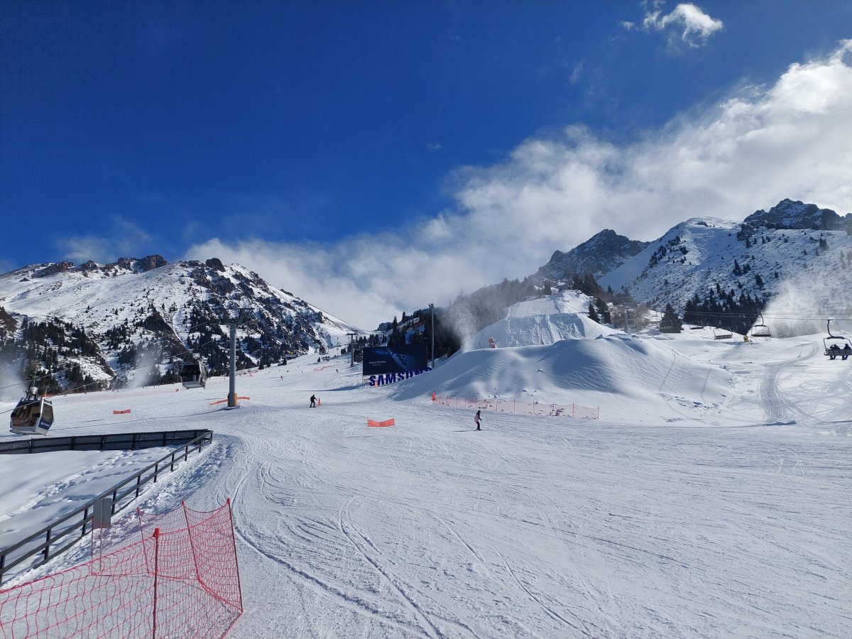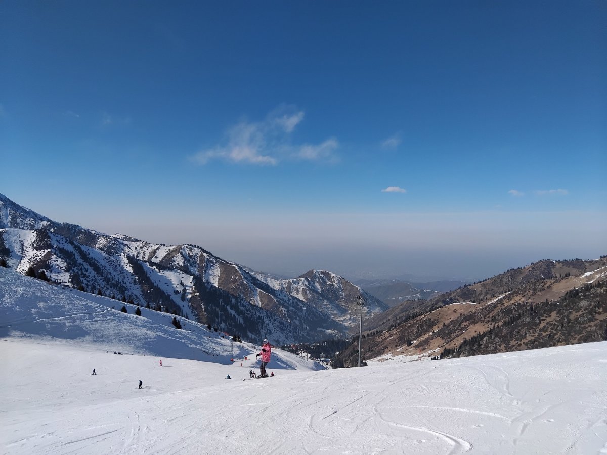 Dole ve středisku jsme před 10. hodinou, lidí už je tam dost, ale pořád se to dá. Půjčovna lyží vypadá luxusněji než kdekoliv v Česku. Jen je problém, že si tam půjčují lyže skoro všichni, co na Šymbulak přijíždí, a tak je tam fronta skoro na hodinu. My volíme jen dopolední skipas (do 13:30). Déle to nestíháme. Musíme se totiž ještě dostat do Kyrgyzstánu, odkud nám zítra ráno v 5 letí letadlo. Lyžovačka je suprová, počasí luxusní. Jedinou připomínku mám na lyže, které nemají vůbec nabroušené hrany, a to jsme nebrali nejlevnější kategorii. Po chvíli taky zjišťujeme, že Kazachové a taky Číňani, kteří to sem nemají daleko, jezdí jako kamikadze, často padají a přitom sráží i další lyžaře. Přes to všechno je to jedna z lyžovaček, na kterou asi nikdy nezapomeneme.