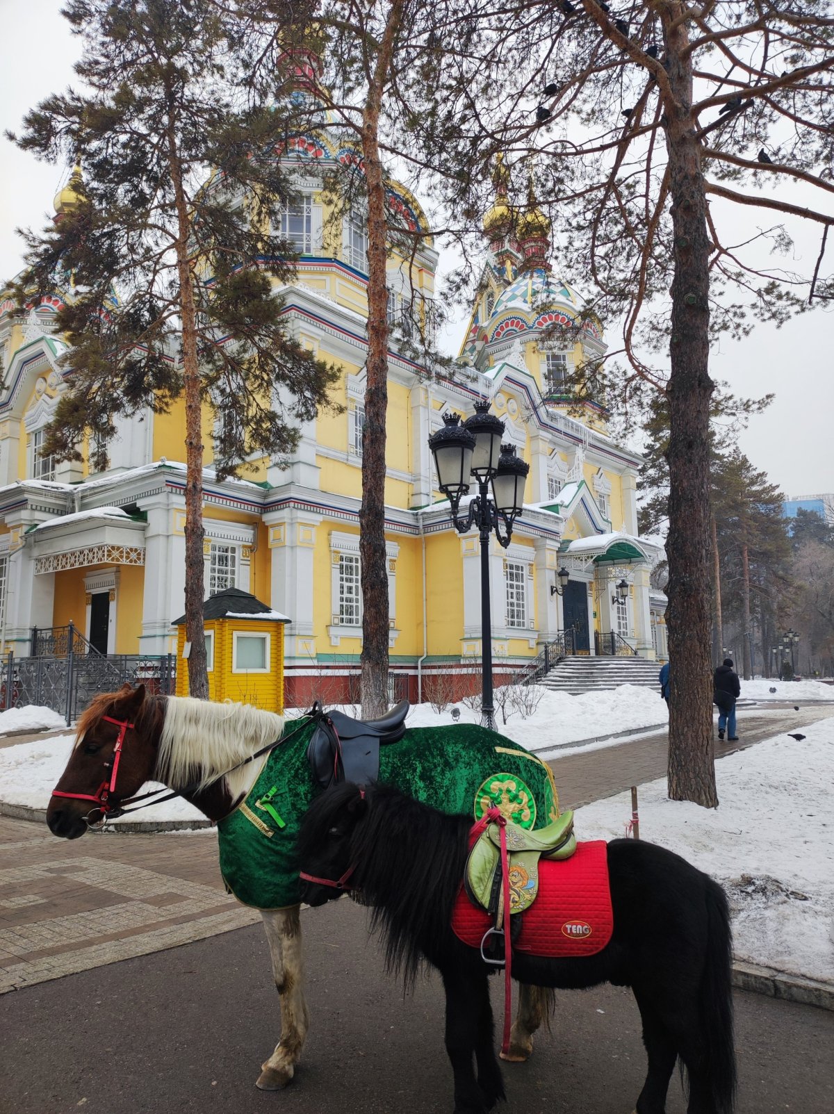 Další v pořadí je nejznámější památka v Almaty: Chrám Nanebevstoupení páně. Je kousek od Green Bazaaru a vstup je zdarma. Dost nás překvapil interiér, který byl na pravoslavný kostel opravdu nádherný. Před chámem jsou nabízeny projížďky na koni, my ale odoláváme.