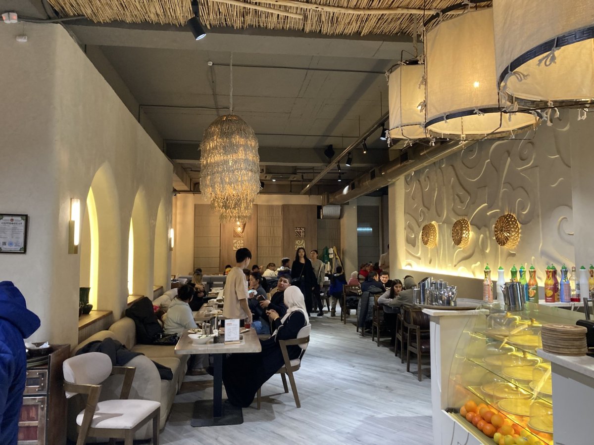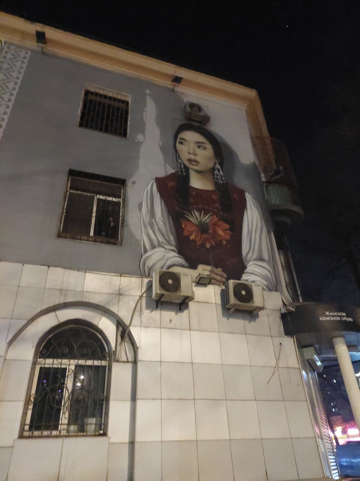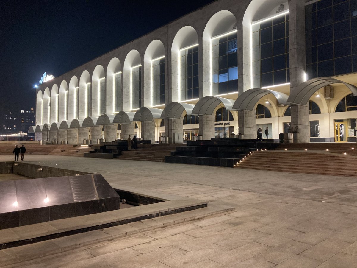 Vystupujeme u hlavního náměstí, nebudu lhát, tak pěkné zase není. V Kyrgyzstánu je nejlepší příroda, ale její návštěva je v zimě s naší časovou dotací nemožná. Procházíme centrem, hledáme místo na večeři a první pořádné jídlo dne. Zaujme nás pěkná restaurace Mubarak, kde je i v 23:00 plno a tak musíme čekat. Ujímá se nás skupinka místních vysokoškolaček, které nás berou do jiné pobočky stejné restaurace, zde je opět plno, ale zapisují nás na čekací listinu. Nevíme, jestli je to hladem, ale jídlo je perfektní, restaurace je plná mladých lidí, můžeme ji jenom doporučit.
