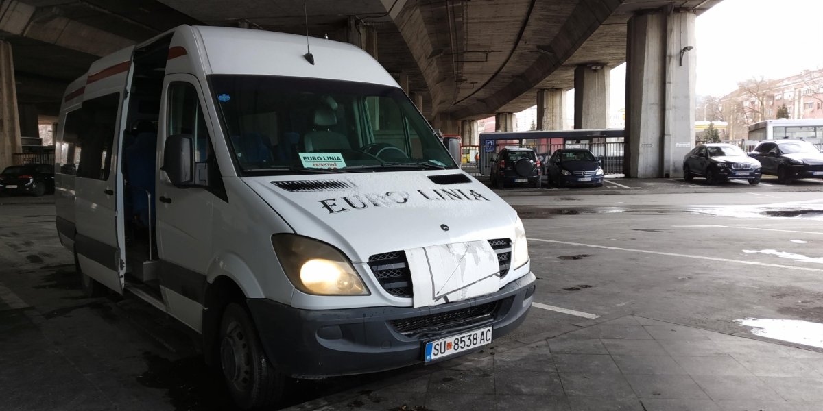 Na trase mezi Skopjí a Prištinou jezdí více dopravců, ve většině případů s minibusy různorodého původu, vzhledu i stavu. Spoj v 11:00 je provozován dopravcem Euro Linia s Mercedesem Sprinter, minimálně v našem případě už v poměrně značném stádiu rozkladu. Ale tak co, nejsme v Německu...