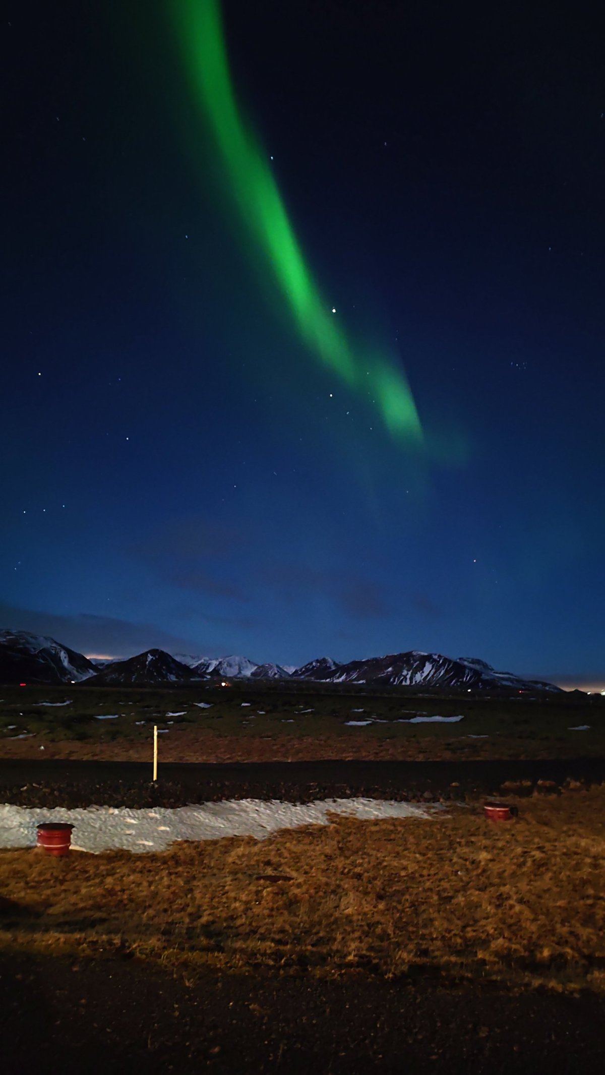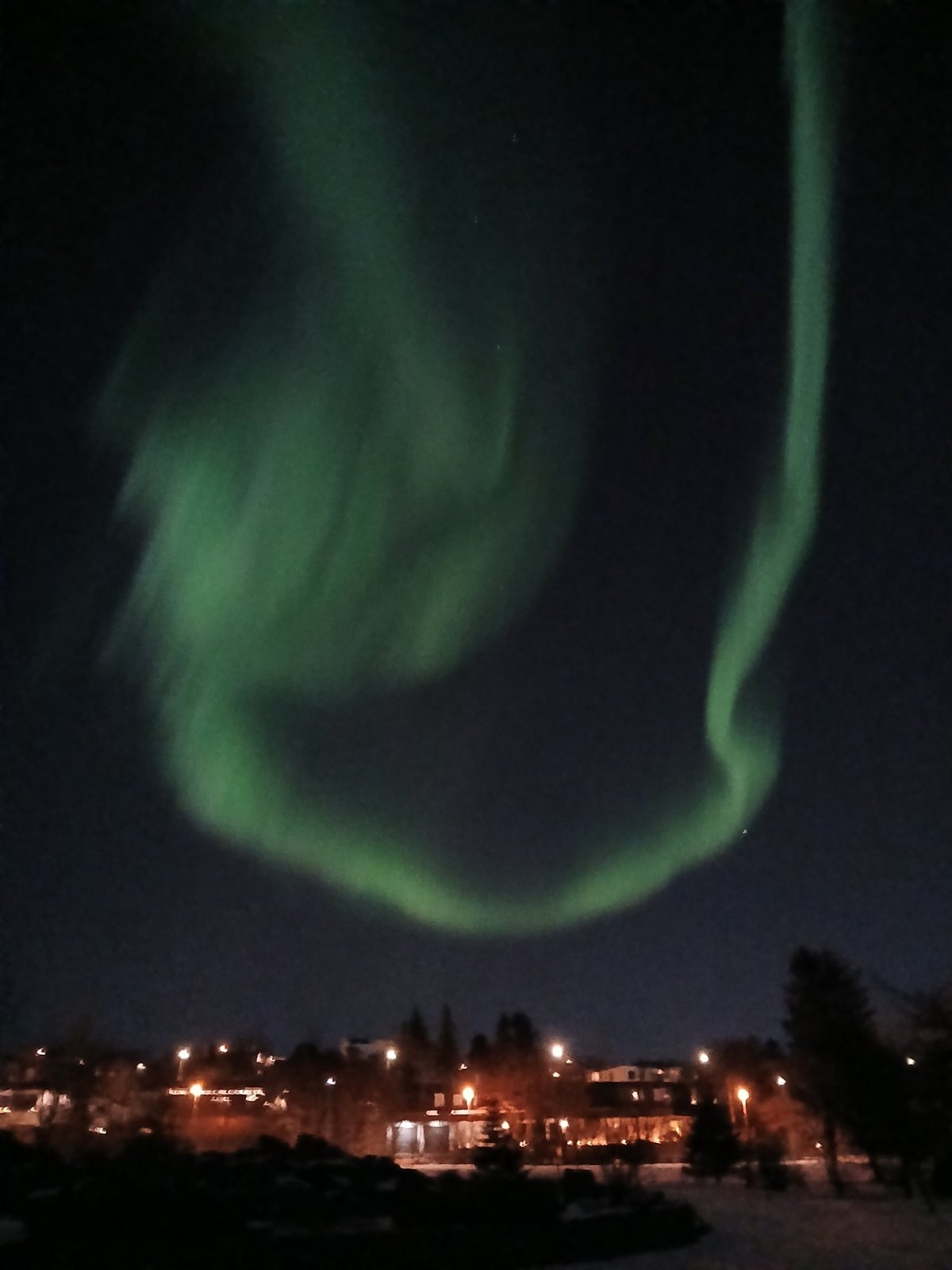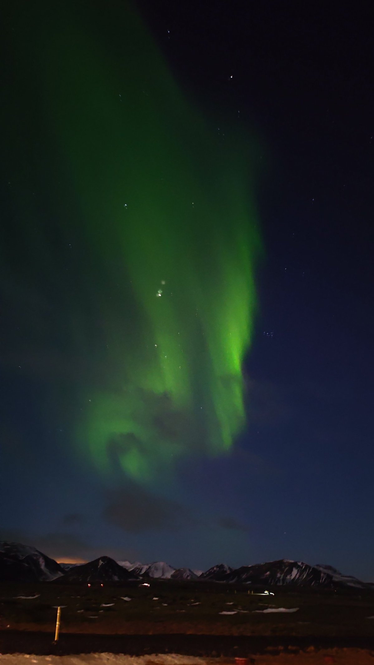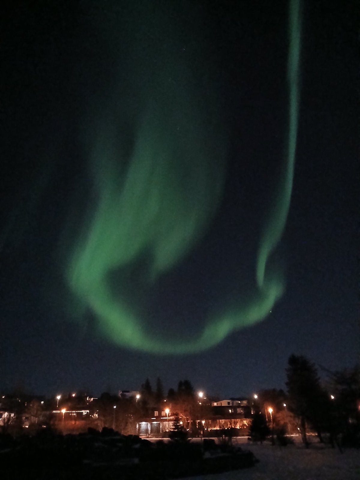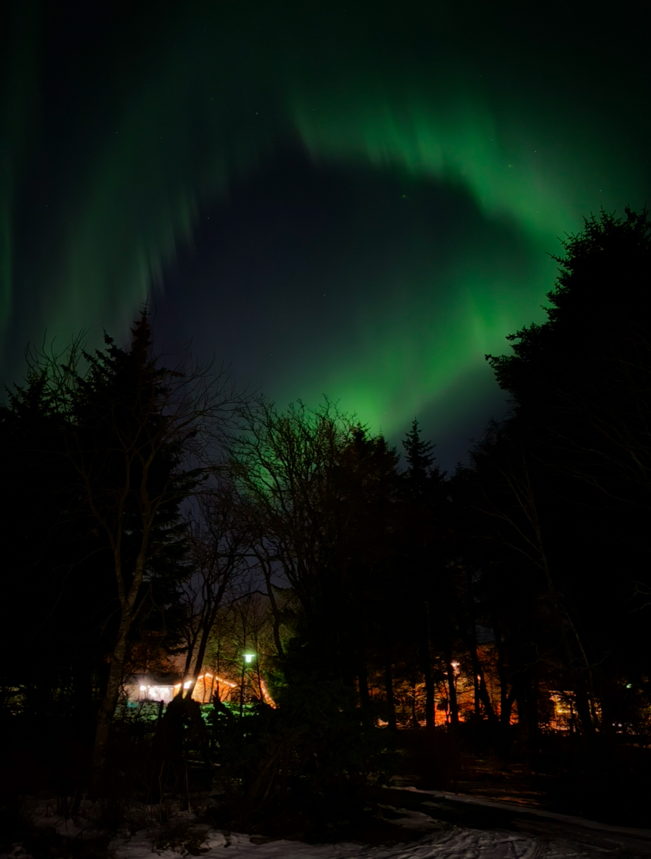 Po večeři píše Oskar do skupiny, že je velká šance vidět auroru. Tedy ne tu loď, ale polární záři. Sledujeme situaci a opravdu se objeví. Máme výhodu, že bydlíme na kraji města a okolo nás je velký park, tedy minimum světelného smogu. Stačí vyběhnout ven a kochat se. Na obloze se kroutí zelené čáry. Zkušenější fotografové staví stativy. Já se spokojím s fotkou na mobil a raději si užívám to představení. Sofia říká, že můžeme vyjet do hor za Reykjavík. Tak se všichni naskládáme do dvou aut a jedeme. Hory jsou nádherné, obloha jasná, ale záře už pomalu slábne a my jsme dost vymrzlí.