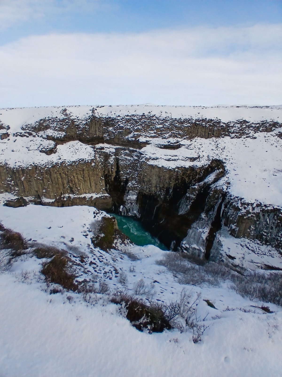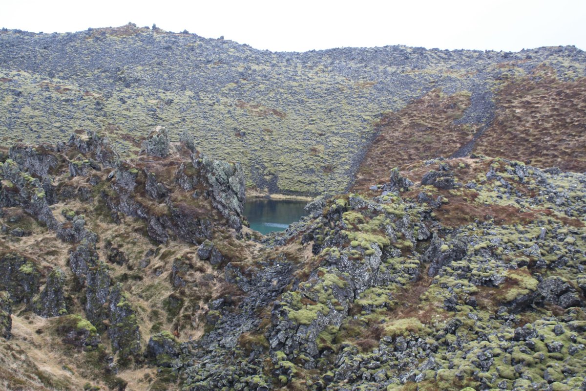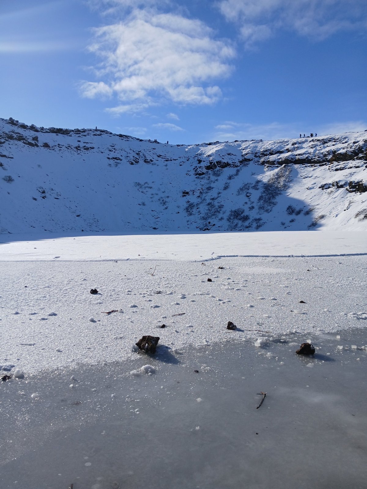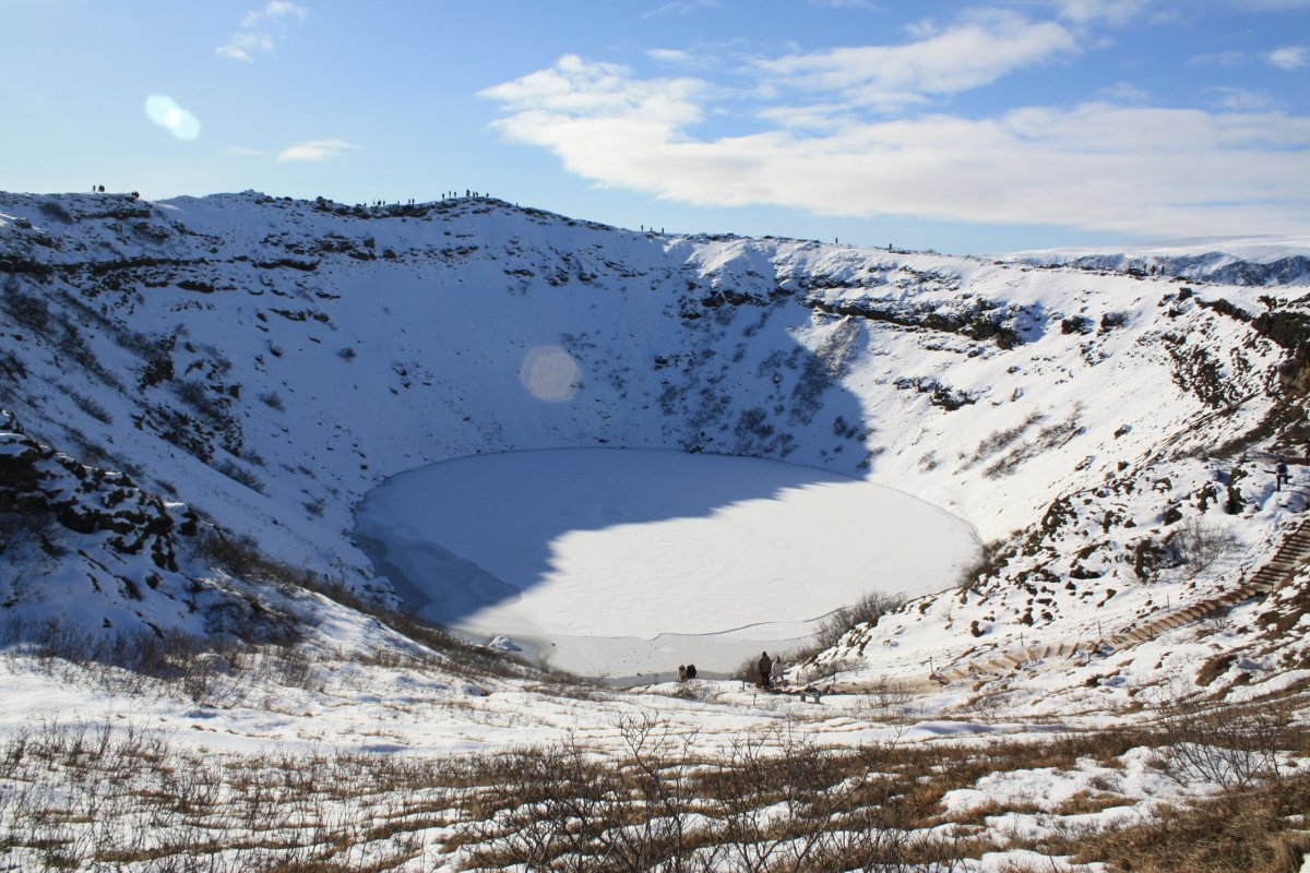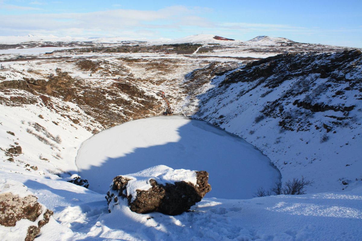 Máme nádherné slunečné počasí. První zastávka kráter Kerid, který pochází ze sopečného výbuchu, který se zde udál zhruba před 3 000 lety a vytvořil cca 170 metrů širokou a necelých 55 metrů hlubokou prohlubeň. Ta se postupně naplnila dešťovou i podzemní vodou a díky sopečným horninám vytvořila jezírko. Podle fotek bývá nádherně modré, teď je ovšem obklopené sněhem a zamrzlé. Obejdeme ho celé.