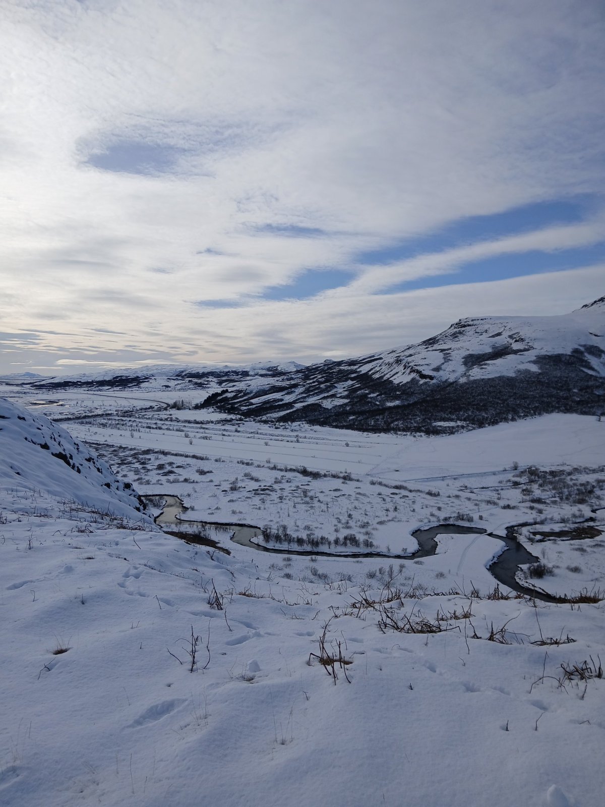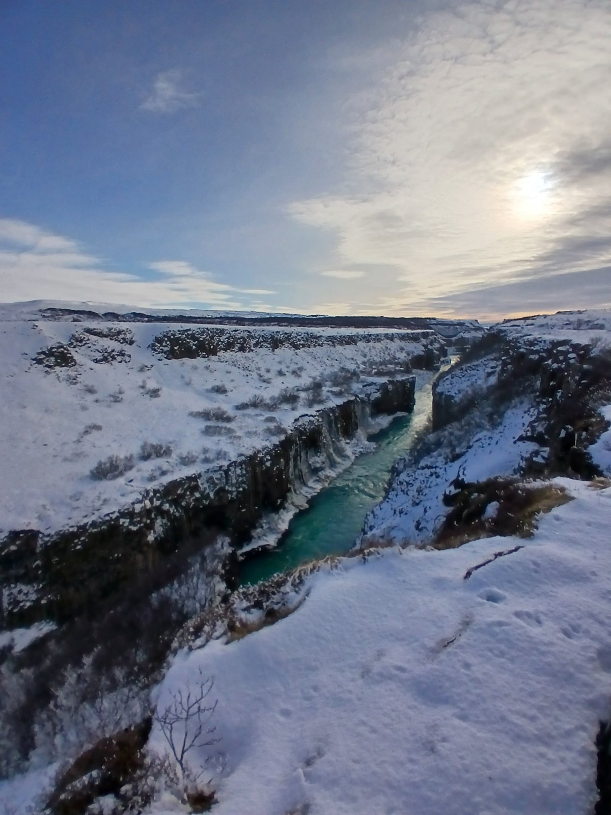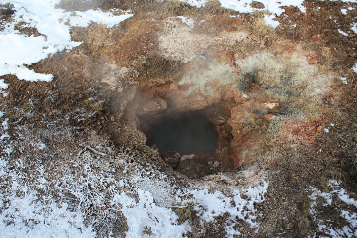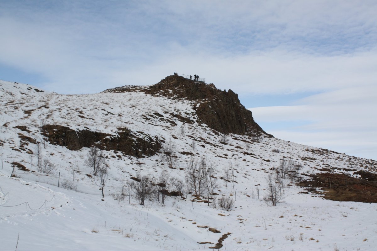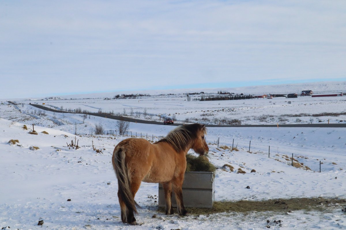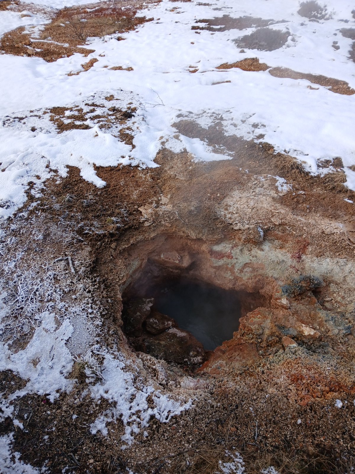 Máme nádherné slunečné počasí. První zastávka kráter Kerid, který pochází ze sopečného výbuchu, který se zde udál zhruba před 3 000 lety a vytvořil cca 170 metrů širokou a necelých 55 metrů hlubokou prohlubeň. Ta se postupně naplnila dešťovou i podzemní vodou a díky sopečným horninám vytvořila jezírko. Podle fotek bývá nádherně modré, teď je ovšem obklopené sněhem a zamrzlé. Obejdeme ho celé.