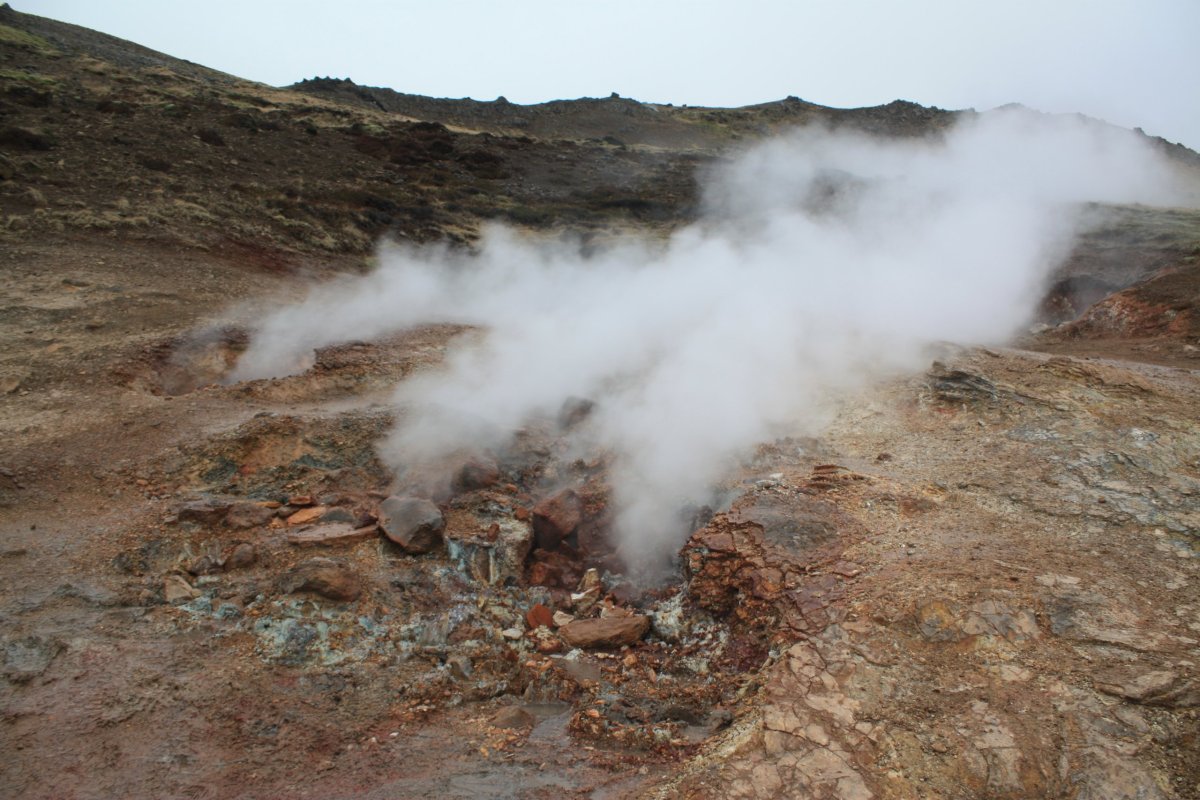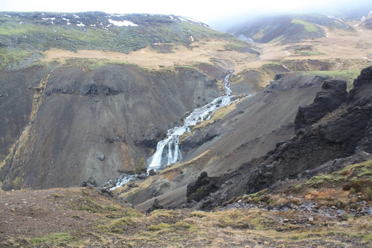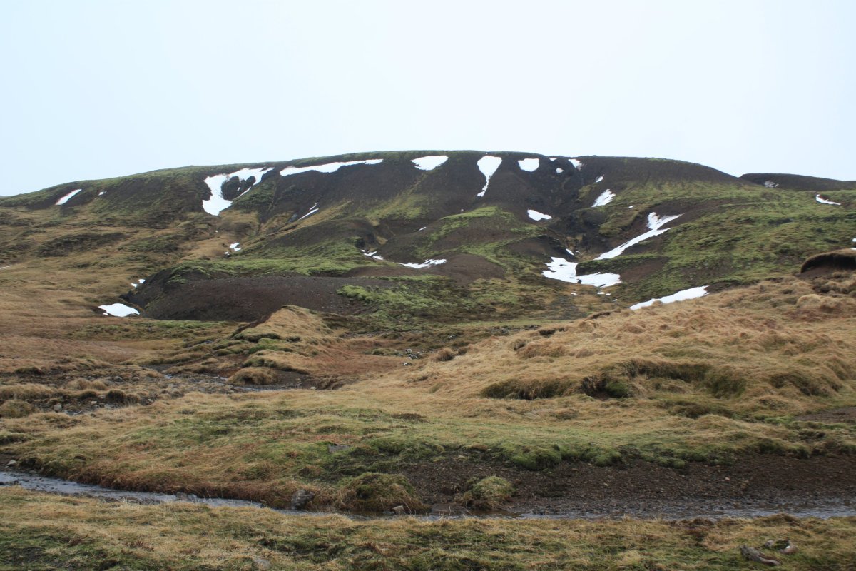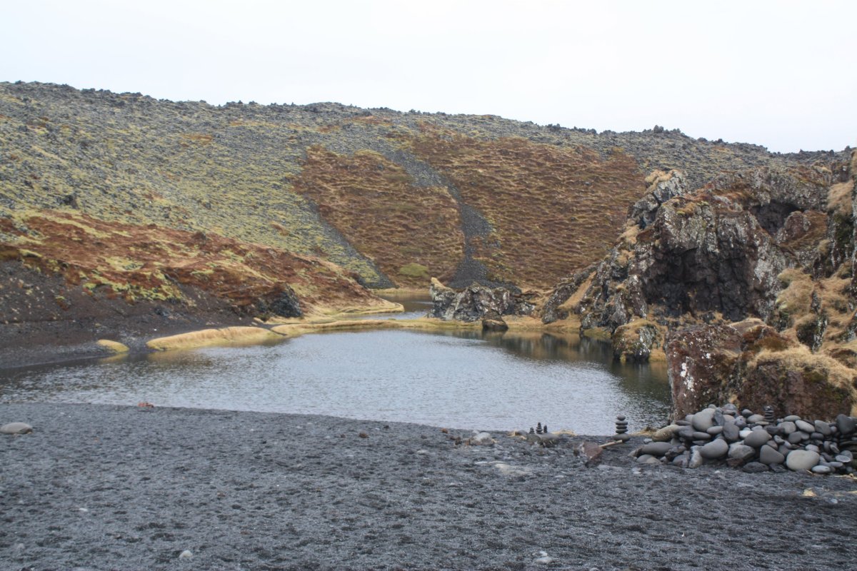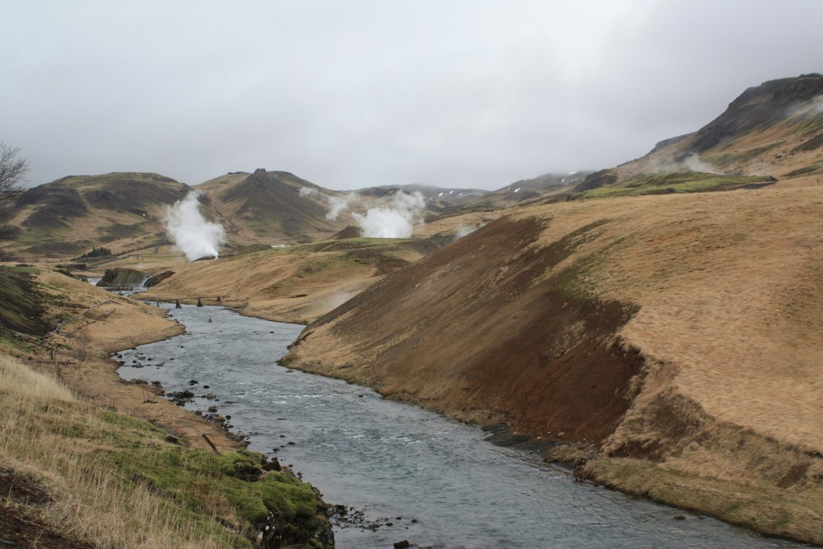 Jméno vesnice Hveragerði, cíle své cesty, jsem si radši napsala na papír. Nejsem si moc jistá výslovností. Paní mě vyhodí u benzínové pumpy. Projdu vesnicí na sever a pak se vydám proti proudu řeky Varmá a narazím na značenou stezku vedoucí do kopců. Dovede mě až do údolí Reykjadalur. Kopce mají nádherné barvy – černá láva, zelená tráva, bílé zbytky sněhu, hnědočervená zem, vřes. Je tu krásně. Cestou míjím různé termální prameny, většinou dost horké. U některých je cedulka upozorňující na nebezpečí opaření. Mým cílem je ovšem místo, kde se tyto prameny mísí se studenou vodou vodou říčky Reykjadalsá a v přírodních tůních vytvoří vodu o příjemné teplotě. Jsou tu postavené dřevěné chodníky, lavičky i dřevěné ohrádky, které trochu chrání před všudypřítomným větrem. Rychle se převléknu do plavek a hupnu do vody. Je to paráda. Voda je krásně teplá, ale dost mělká, takže je třeba si lehnout. Je to nádherný pocit ležet v teplé vodě a užívat si ten výhled.