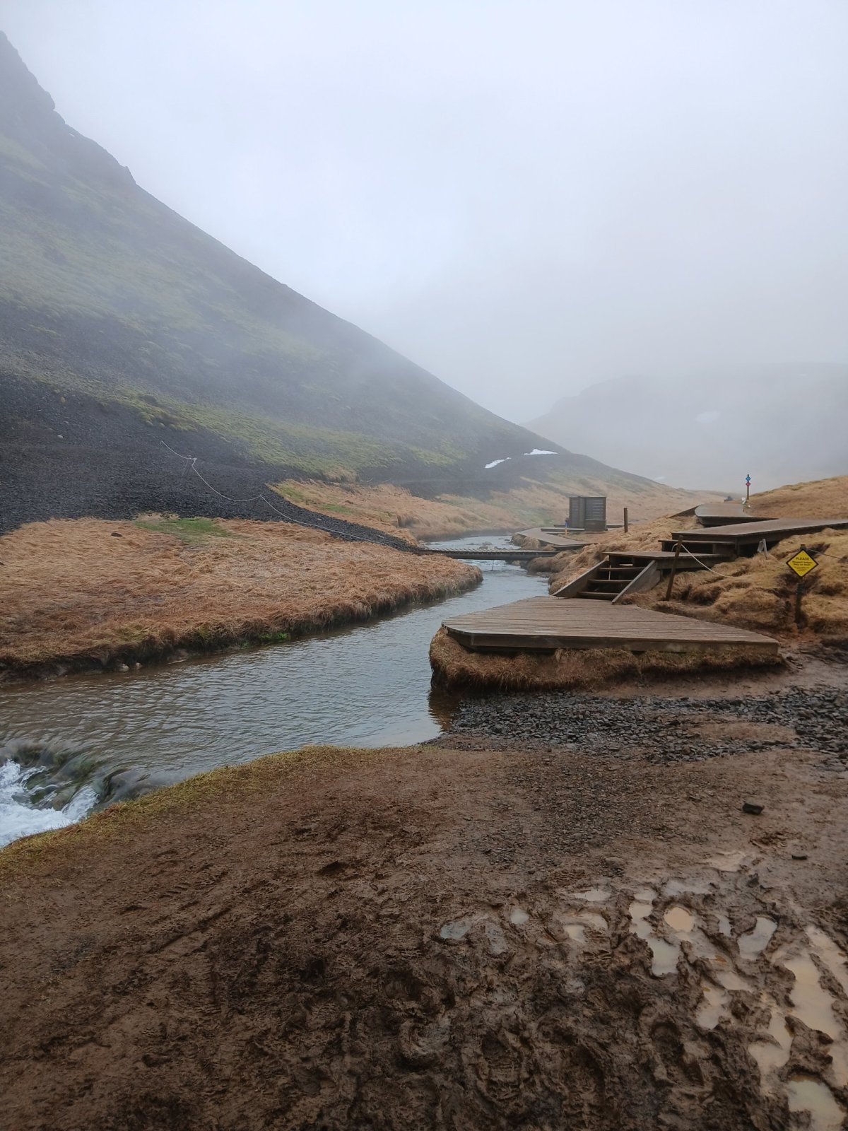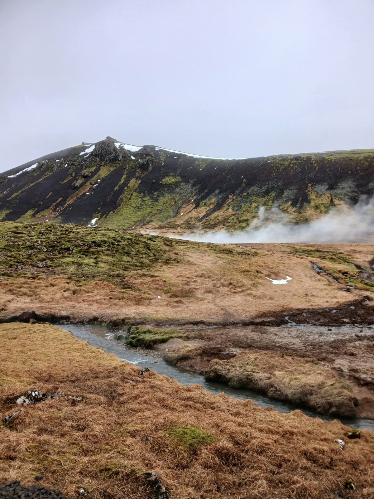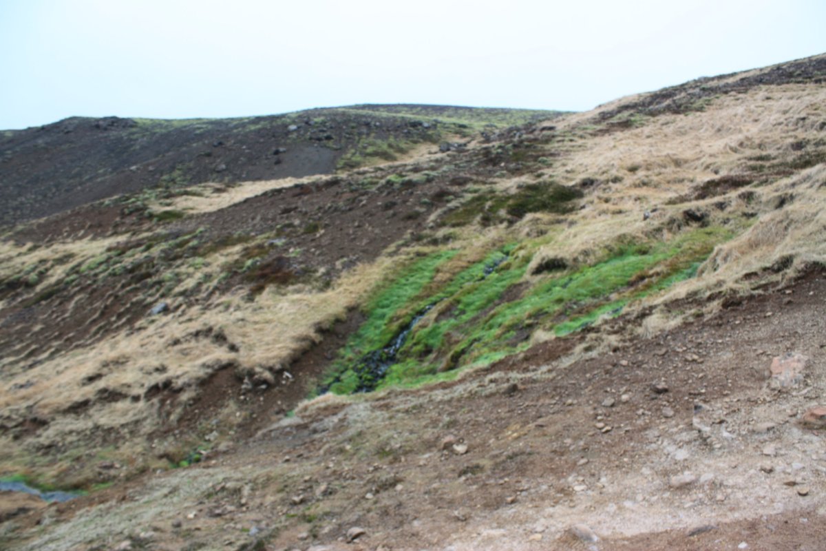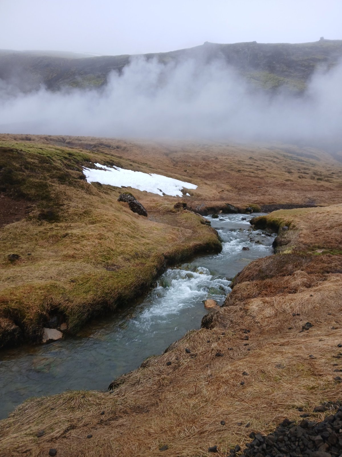 Jméno vesnice Hveragerði, cíle své cesty, jsem si radši napsala na papír. Nejsem si moc jistá výslovností. Paní mě vyhodí u benzínové pumpy. Projdu vesnicí na sever a pak se vydám proti proudu řeky Varmá a narazím na značenou stezku vedoucí do kopců. Dovede mě až do údolí Reykjadalur. Kopce mají nádherné barvy – černá láva, zelená tráva, bílé zbytky sněhu, hnědočervená zem, vřes. Je tu krásně. Cestou míjím různé termální prameny, většinou dost horké. U některých je cedulka upozorňující na nebezpečí opaření. Mým cílem je ovšem místo, kde se tyto prameny mísí se studenou vodou vodou říčky Reykjadalsá a v přírodních tůních vytvoří vodu o příjemné teplotě. Jsou tu postavené dřevěné chodníky, lavičky i dřevěné ohrádky, které trochu chrání před všudypřítomným větrem. Rychle se převléknu do plavek a hupnu do vody. Je to paráda. Voda je krásně teplá, ale dost mělká, takže je třeba si lehnout. Je to nádherný pocit ležet v teplé vodě a užívat si ten výhled.